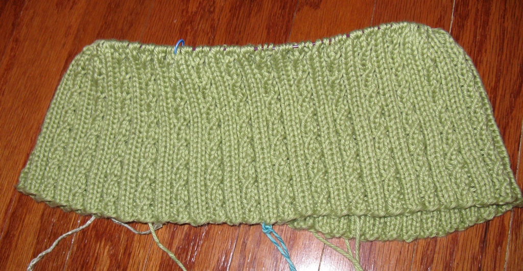 After one horrific day without anything on the needles (what was I thinking?!?), I started Yosemite from Spring 08 Knitty on Tuesday, and despite the fact there’s over 200 stitches on the needles, it’s going pretty quickly- I set a goal of an inch per day (7 rounds), but so far I seem to be knitting at a faster pace. The yarn is Knitpicks comfy, in honeydew, the most perfect shade of light green. It’s not too yellow, not too neon… just right, a light green, almost with a grey undertone. The yarn is ridiculously soft, and when knit into this ribbed cable pattern, so squishy, it almost feels like merino. Though Comfy is 25% acrylic/75% cotton, I don’t notice the synthetic content, which is a good thing for this natural fiber fan!