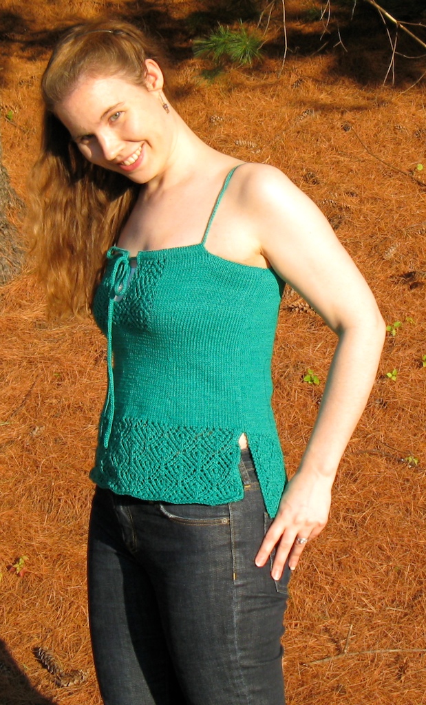 I love this top! My only mods were adding about 1.5″ of additional length above the bust increases, and I didn’t do the garter stitch selvedges on the stockinette portion (did not see the point of this, as the selvedges are hidden in the seam anyway). The lace was lots of fun to knit, and the stockinette parts went quickly. The princess-line shaping is a nice change of pace from the usual side shaping. The only part I didn’t like was the 75″ of 3 stitch icord, but even that didn’t take too long in the end. Seaming was a breeze- just two pretty short straight seams.