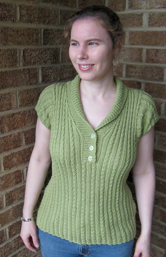 I love so many elements of this design… the cables, the shawl collar, the cap sleeves… seemed the perfect summer top for work, where I’m always freezing under the AC. Comfy worked out great, spot-on stitch and row gauge on US 6 needles. The pattern is very detailed. My only mod was doing a few less rows (and decreases) above the armholes… the 26″ size as written involves enough rows to surpass the schematic armhole depth. I frogged about 4 rows on each shoulder piece and now it’s fine. I probably could have gone a size down, but at least this way it’s very comfortable. One thing to note: if the collar is bound off too tight, it won’t lie properly.