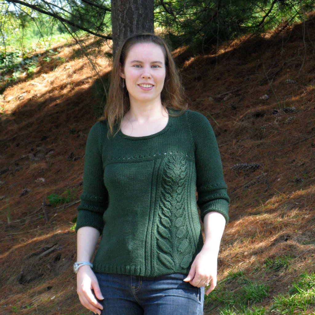 I really enjoyed knitting this sweater, it went quickly despite some errors in the pattern. My only real mod was knitting the increases in the stalk pattern through the back loop, so as to minimize the eyelet effect there. Nevertheless, the eyelet row across the upper chest requires some thought re: undergarments. The back neck extensions were the only part of the pattern I found awkward; first I knitted them to size as shown in the schematic, then I wound up ripping back each significantly. As for the yarn, I love it. Colrain may be a new favorite. It’s soft, luminous, with great stitch definition and the cables really pop. It did grow a bit when wet; this effect was much more apparent in the whole garment, as opposed to a swatch. Despite the growth, it was easy to mold back to size. I will definitely use Colrain again! Below, a closeup of the awesome stitch pattern.