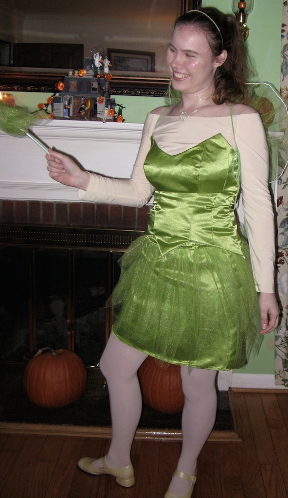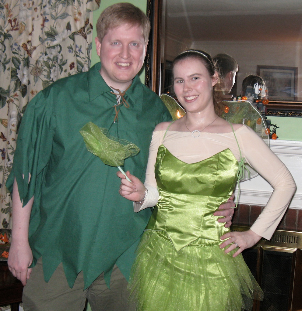 This year I was invited to a Halloween party hosted by my oldest friend. I decided we needed new costumes for the occasion. Some years ago, I sewed up vampire outfits for C & I. We’ve worn them a few times, but not in recent years, as grad school commitments have precluded any real Halloween partying. Sad, that. I love Halloween and I wanted to be Tinkerbell! C agreed to Peter Pan as long as I would sew the costume, and no tights would be involved. Here we are, ready to party!