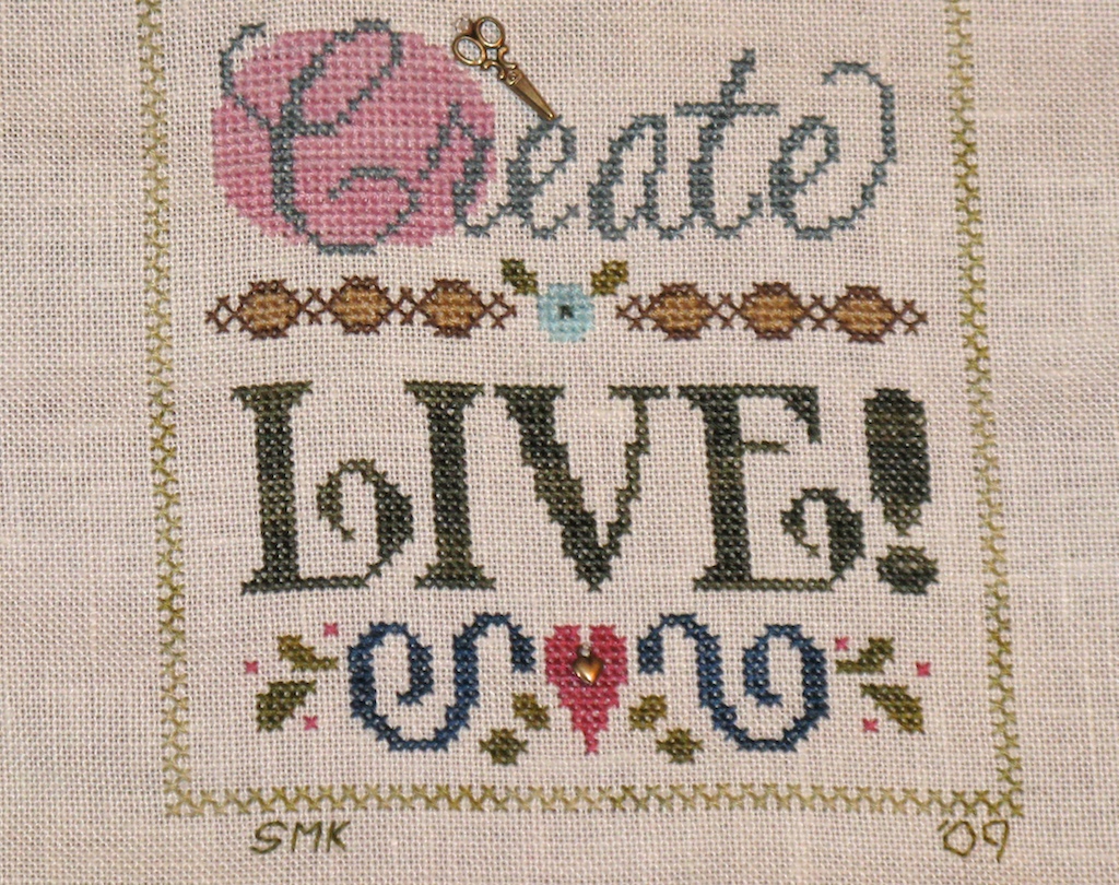 The stitching was fun, each segment or word only took a few evenings, and was like it’s own little happy dance. I’d like to stitch something else like this; the Lizzie Kate Halloween double flips caught my eye. I also like “Woman” by Ruby Slippers Designs (and I have this one kitted up….hmm) and Alphabet Inspirations by A.Fox Originals.