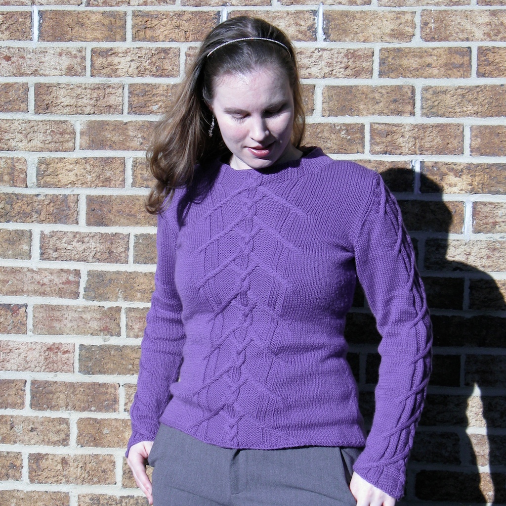I got the yarn on sale from Herrschners, and used about 200 yds less than the pattern requirements so total yarn cost was less than $25. It’s a very lightweight dk; the ball band says you can knit this at 5.25 spi but I think it would be best at 6 spi. I love the color, a true medium purple. Superwash isn’t my favorite, and this yarn seemed almost too soft while knitting. It was splitty and so easy to snag; its prospective durability worried me. I think it will pill quite a lot; it is Merino, so that’s probably a reasonable expectation. However, after a day of wearing, there were no pills. The sweater feels divine against the skin, like being wrapped in a soft, warm cloud.
