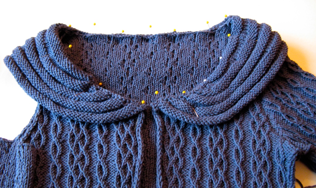 Well, all the knitting is done on this. I have to finish the seaming (I set in one sleeve already), sew on a button loop, and find a button for the top (I want a wooden toggle). I will try to complete the finishing this weekend, speaking of which, there is an errata in the finishing instructions. The bind off edge (not the CO edge) of the collar should be sewn to the neck edge.