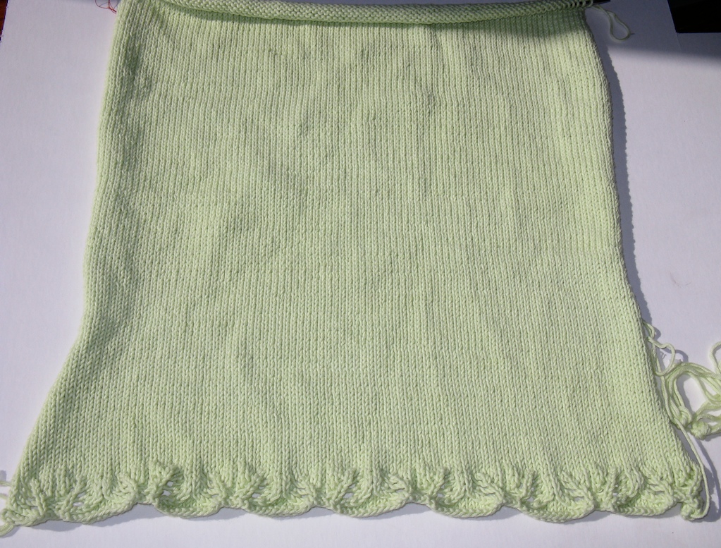 The lace is fun and not too taxing, while the stockinette is speedy. The pattern is well written. The only mods I’ve made so far are for length. I really don’t need this summer top to be 16.75″ inches from armscye to hem; as I’ve said before, I don’t believe it’s flattering when shirt hems hit my body where there’s the most junk in the trunk. Why call attention to it? So I knit the back to 6″ before starting the waist increases, and to 15″ before shaping the armscyes. I’m shaping the shoulders with short rows and will leave the stitches live for a 3 needle bind off.