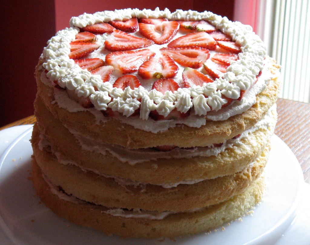 Today is C’s birthday but we celebrated last night as it was a holiday. My parents graciously provided a fabulous meal, while I baked the Strawberry Chiffon Cake. Though I typically bake a red velvet cake, this year he wanted to mix it up. He loves strawberry shortcake, and when I saw Smitten Kitchen’s cake, the tall height said “celebration” to me. And I love to celebrate birthdays in high style! The cake was pretty and C thought it tasted better than it looked. The layers even held together well while cutting and serving; it was light and delicious. My only mod was adding less than half an envelope of gelatin to the whipped cream, to stabilize it as I wanted it to hold together overnight. I don’t have a layer cutter, nor a knife long enough for the purpose, so I used dental floss to cut the layers crosswise. It wasn’t the easiest method, but it worked.
