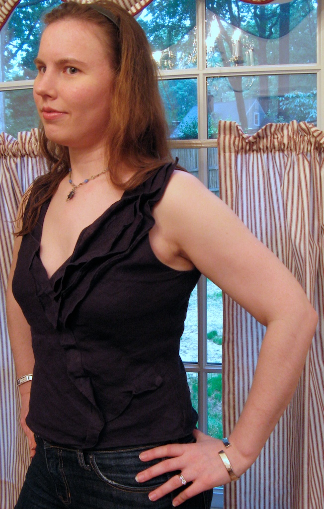 Mine is Vogue 2677 View B (OOP), made from navy handkerchief linen. As I recall, I obtained the fabric crazy cheap from fabric.com. I cut the 12, lots of pieces but the sewing was fun. No mods, quick project. Vogue rates this pattern “average”; challenging elements include the fact that every piece is cut on the bias, and the patience required to sew MANY narrow hems, but an adventurous beginner could handle it. I love this shirt for its featherweight, perfect for hot summer nights, the deep vneck and flirty ruffles. It requires a thorough pressing before each wear, as the ruffles tend to go awry, but no big deal. This would be less of issue if I’d used a fabric with less “body”, like chiffon. The dark linen has the advantage of being opaque, a good thing when it’s beastly hot and muggy outside and I do not feel like layering.