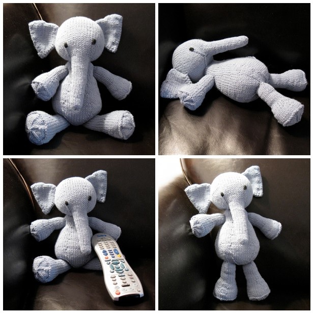 The many moods of Elijah…. at ease, kicking back, channel surfing, taking those first steps. So I made this little toy for my friend’s baby. I used Cotton Ease, because I wanted something washable and my options were limited to what was available at Michaels, on sunday afternoon. The pattern is written for dk, and Cotton Ease is aran-weight, so the toy is a little bigger and I had to use bigger needles. Even so, knitting this yarn on Size 5s bothered my hands, so I paced myself. The pattern is great, clever, clear, and easy. Well, the circular cast on gave me some trouble, but I eventually figured it out. The other hard part was picking up stitches off the already stuffed body; I had to use an extra needle to manipulate the fabric. Also, using the dpns was just generally fiddly; it would have been easier with shorter dpns. I embroidered the eyes, as I wanted them to be safe for an infant, and I ripped them out twice before I found this tutorial. Very helpful! I hope Baby Z will like the toy.