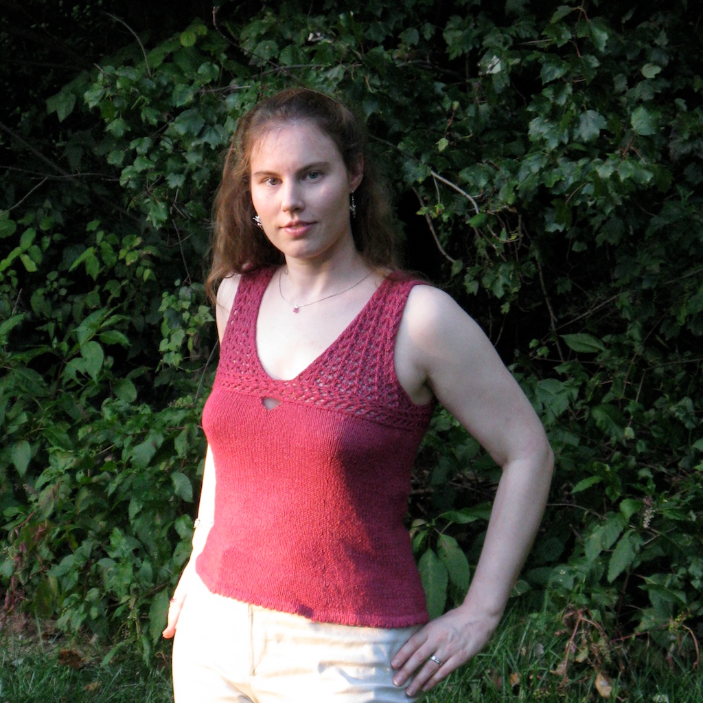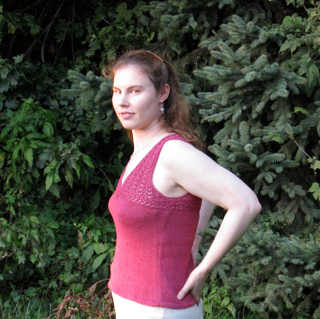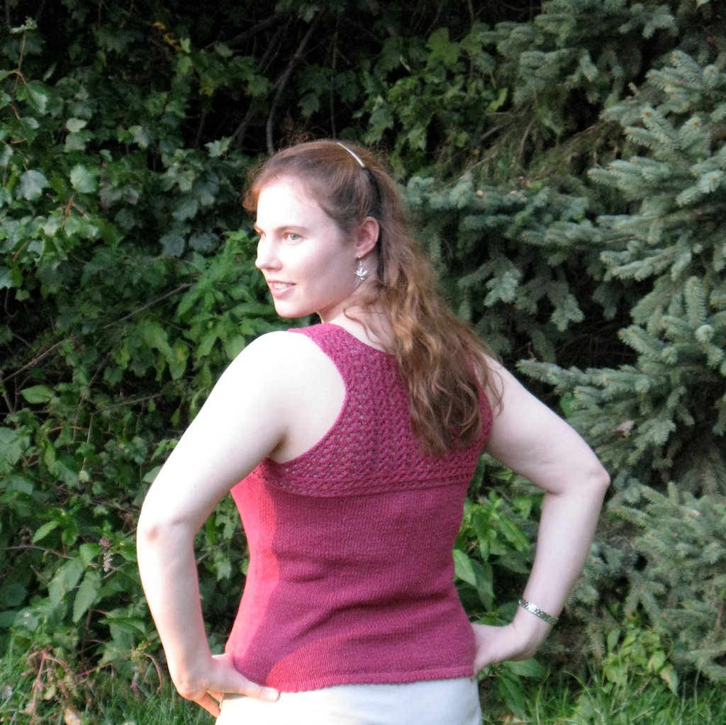 The pattern was easy and fun. The racer back was a fun and somewhat unexpected detail. I found the shaping a bit odd- it seems that the bust shaping (decreases) starts at a point that would be above the biggest part of the bust (only 1/2″ down from the horizontal band at high bust). I considered moving the shaping down and/or adding short rows, but ultimately decided against it. A secure fit around the bust is a good thing for a tank top, especially one with a keyhole. As for mods, I knit stockinette selvages throughout- I find these easier to work with than garter, and I made a regular picot hem (yo,k2tog across) because I preferred it. I skipped the crochet edging because it seemed unnecessary.
