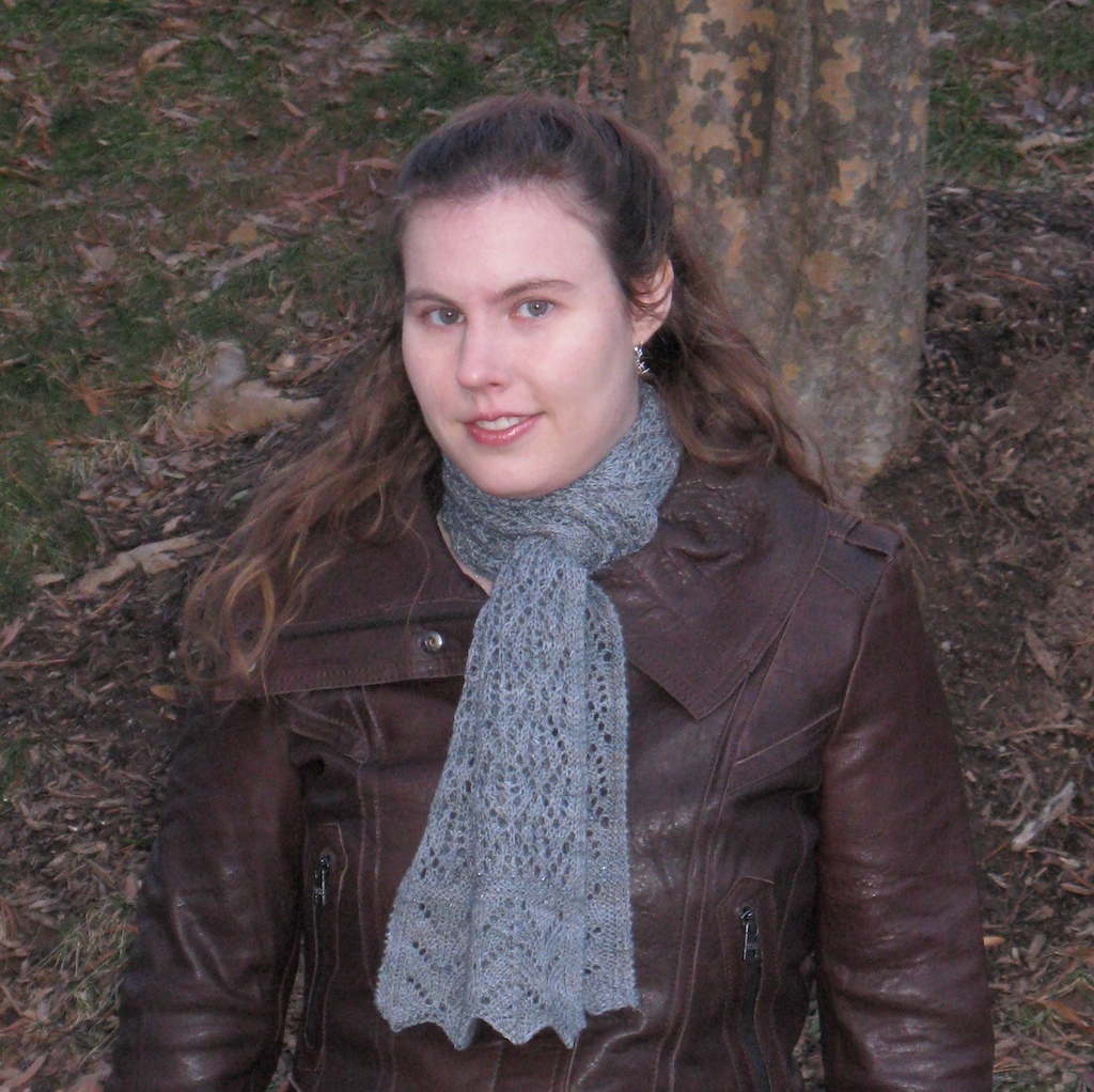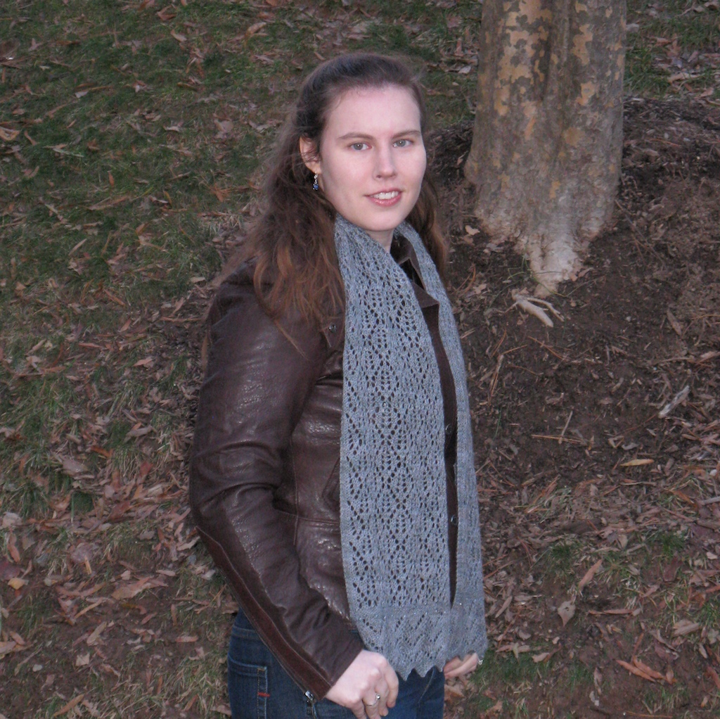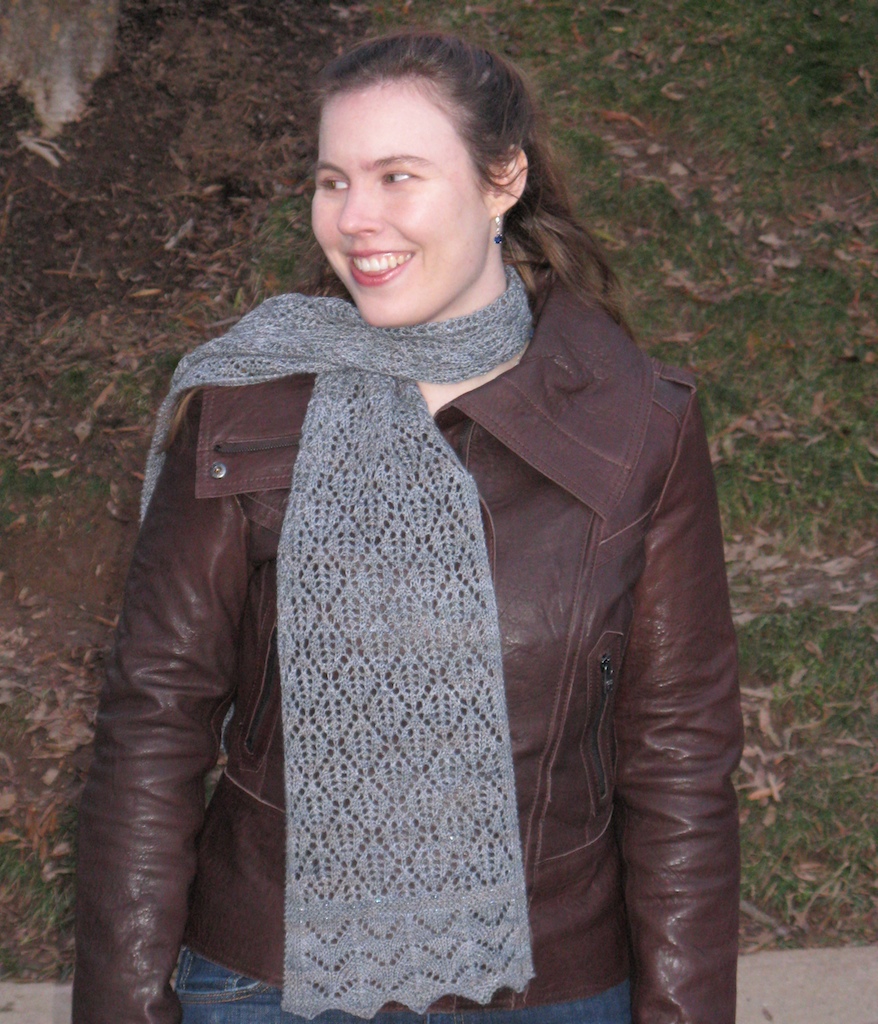 For the finishing, I used the blocking wires that my parents gave me for Christmas. I soaked the scarf in warm soapy water, rinsed, then spun it out in a salad spinner. I threaded the wires through the edges but by the time I got it all laid out and pinned down under tension, the scarf was pretty much dry. So I spritzed it and steamed it. A day later, it was dry, I removed the wires and the size remained static, the lace open and flat. Probably not a surprise to those who knit a lot of lace, but for me it seemed like a miracle as I’ve only knit a few large lace pieces in the past, and none of those projects really blocked successfully, perhaps due to yarn choice (why oh why did I knit my diamond fantasy scarf in cotton?). It was a chilly twilight when these photos were taken, but here’s one more to show that the scarf is indeed long enough to wear folded.