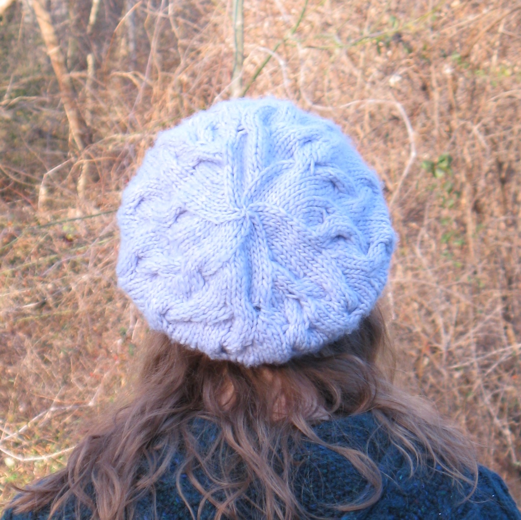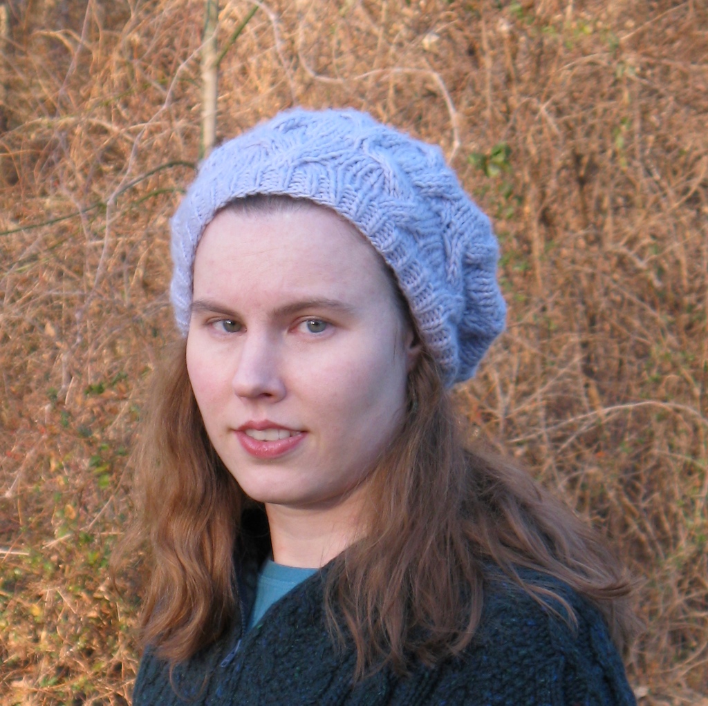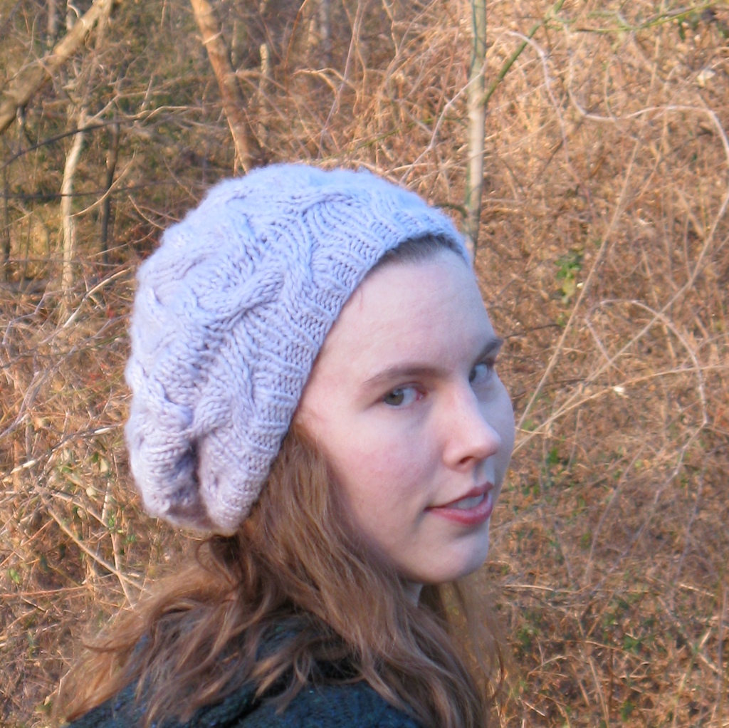 The finished project is pretty big (on my small head). I blocked it with steam over a dinner plate, and I pat it down over the back of my head after I throw it on, which helps it slouch nicely. The hat is so soft, it’s like wearing a cloud on my head, and it’s loose enough that it doesn’t mess up my hair. However, it is necessary to hold it down occasionally, in high wind. I love this hat and I do believe there will be a Malabrigo sweater in my future.