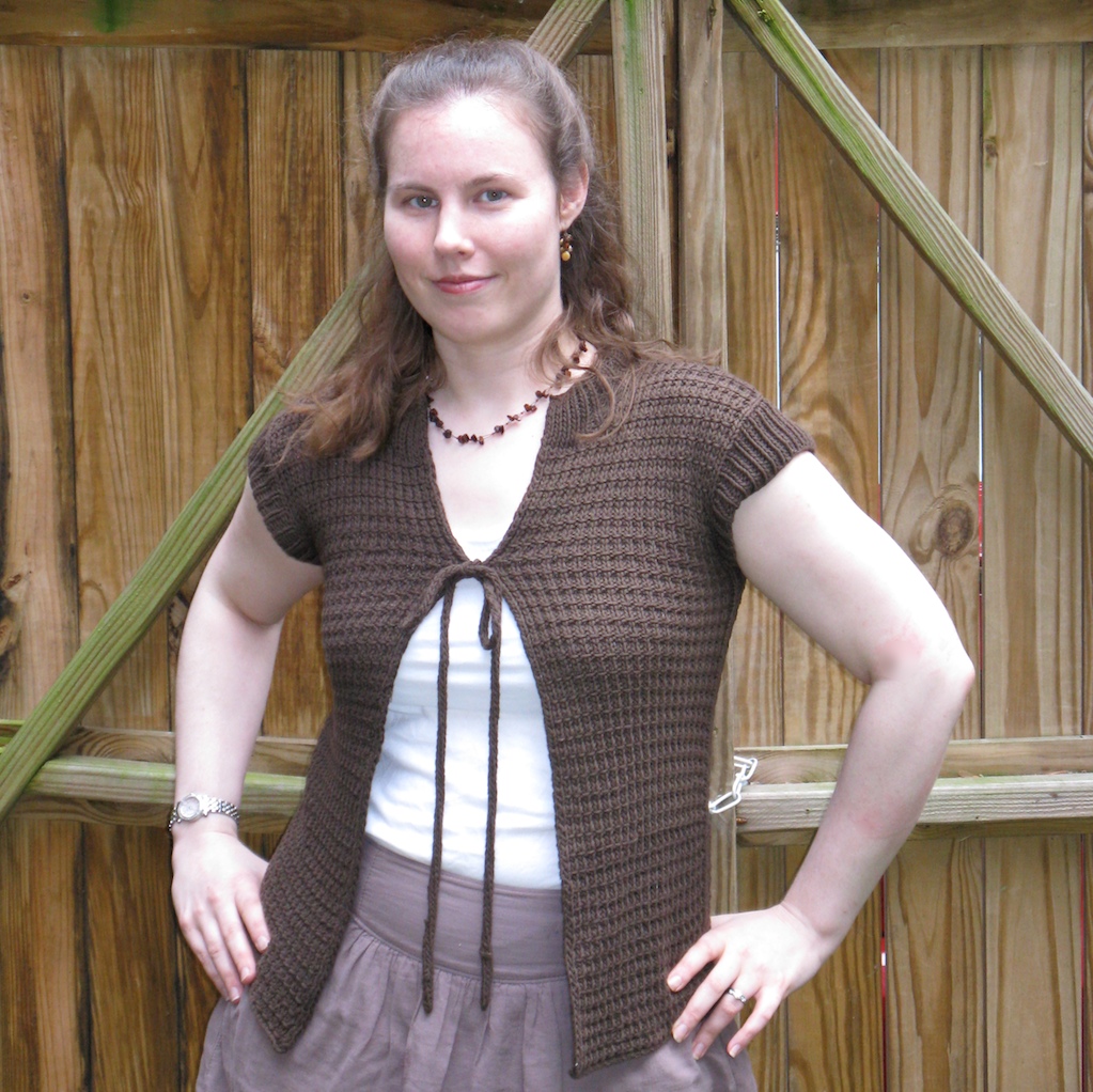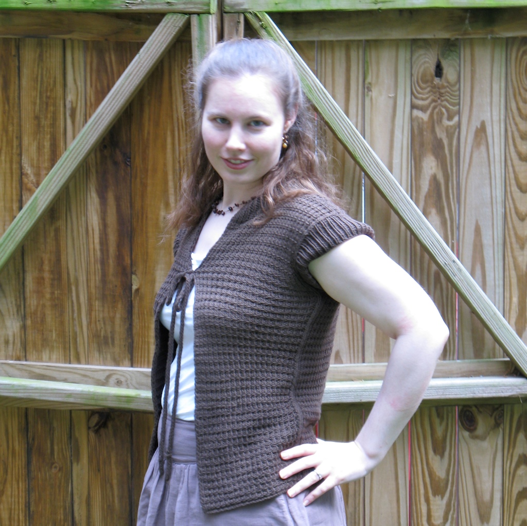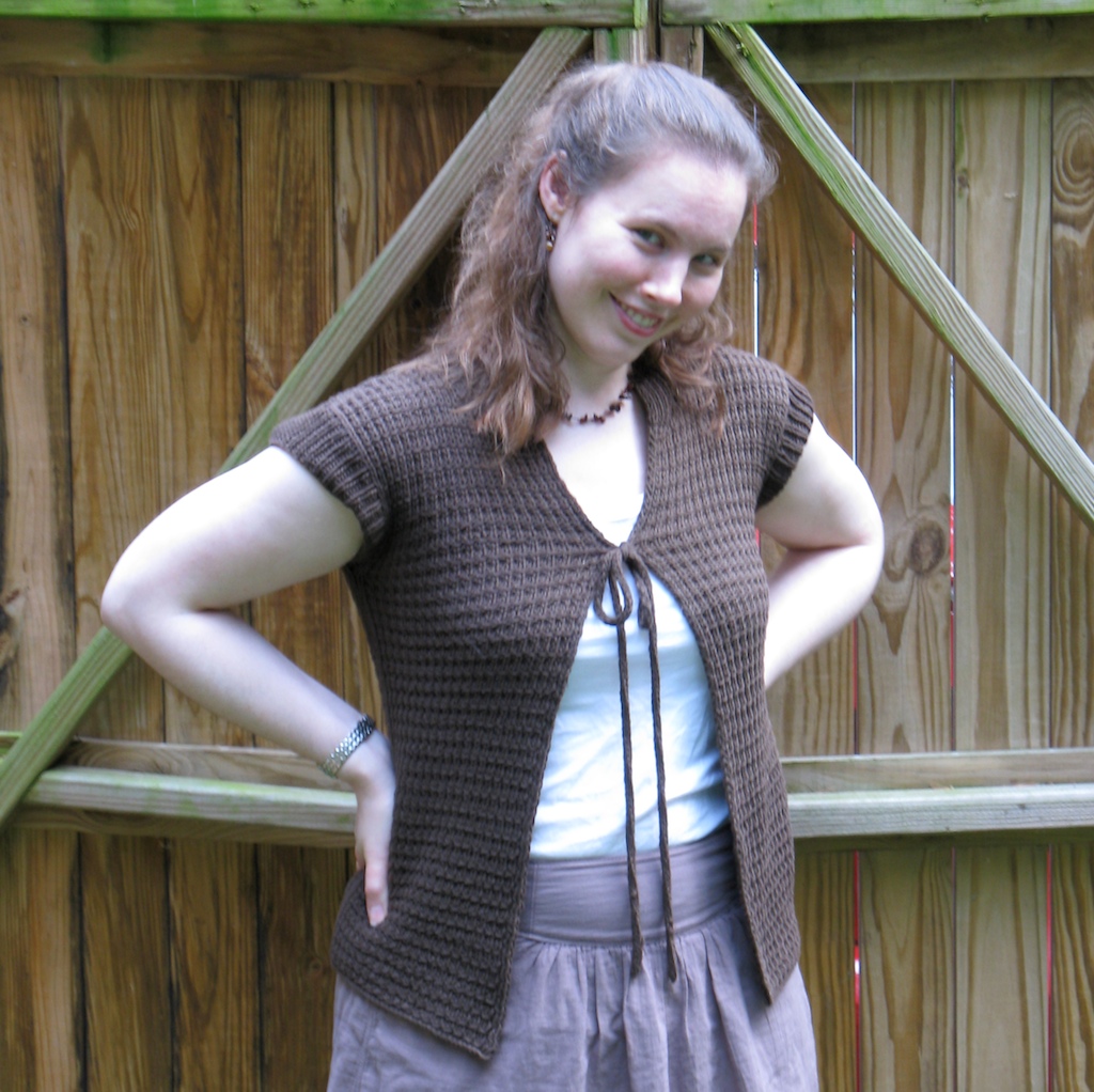 I’m glad this is finally out of the WIP pile and into my wardrobe. It’s a nice layering piece to combat a cool breeze or overzealous air conditioning. I don’t have many brown sweaters, and this dark neutral with go well with other clothes.