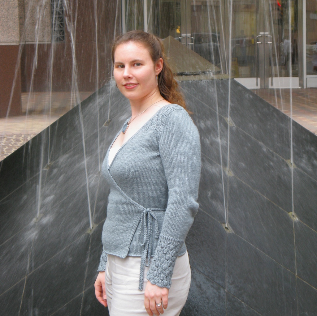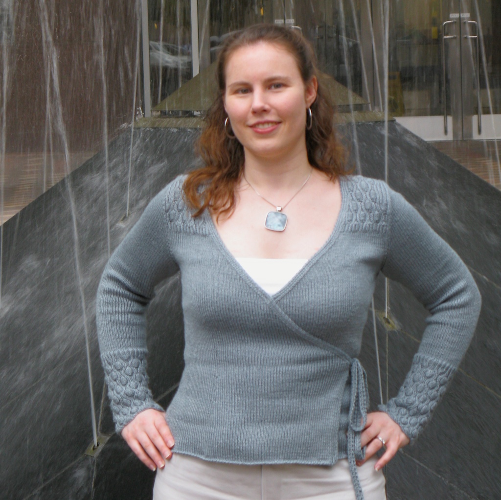 So, here’s my first handknit wrap sweater. Overall, I am pleased; the sweater feels both slinky and elegant. It’s a nice light layer for summer, not too warm. However, I find the style a bit of a challenge to wear.