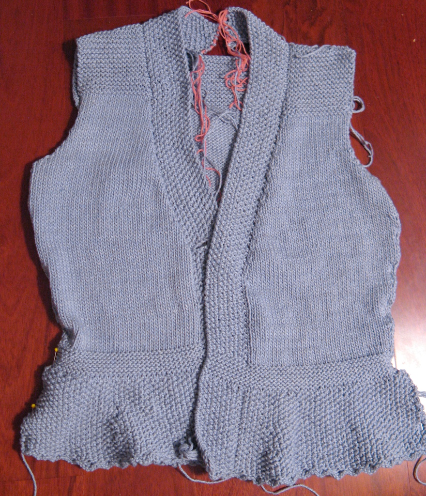 working up into a nice firm fabric on relatively small needles and the color, a subtle gray-blue, is great, so I’ll stick with it, but I probably wouldn’t use it again. Funny, I’ve used Saucy before (in the sportweight) and I had a completely different experience… the yarn was much more matte, and also the quality was much better. I tried something new for the buttonholes, the “Tulip’s Improved Horizontal Buttonhole” from the Summer 2010 Interweave. I bound off/cast on 4 stitches for each. This method does create a nice neat buttonole, which is certainly more stable than the k2tog, yo method. I look forward to picking out big, pretty buttons for this project. I’m hoping to make quick work of the sleeves and have a FO soon.