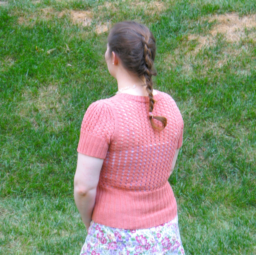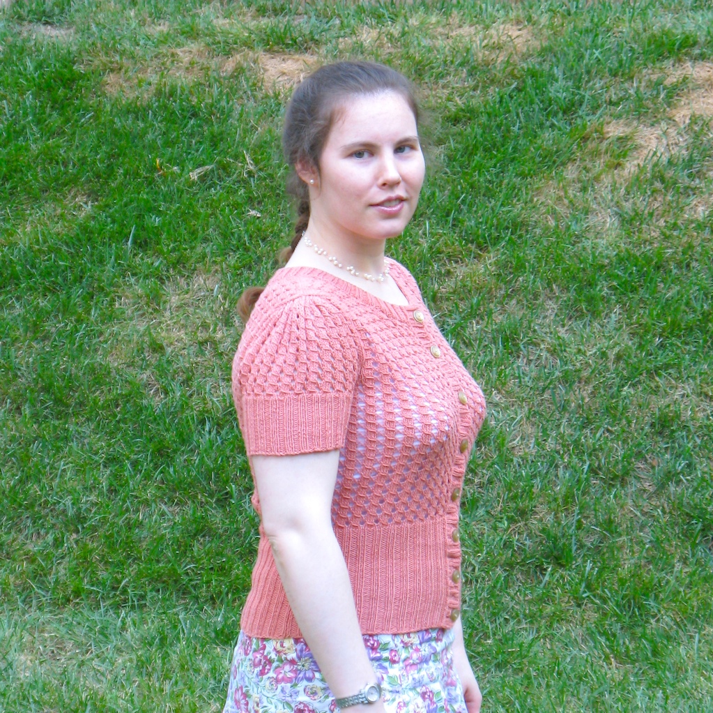 I really like the yarn, it’s a thin sportweight in a practical fiber composition (cotton/wool), and it has a slight sheen from the viscose. The yarn has about 6 plies, tightly spun and and it’s easy to knit by touch. The knitted fabric is soft, light and drapey. The color is a nice warm pink/peach, about as close to orange as I can wear. It was fun to knit after several projects in blue and green. I’m glad to have another lot of “Bella” in a different color; it’s too bad this was a limited edition.