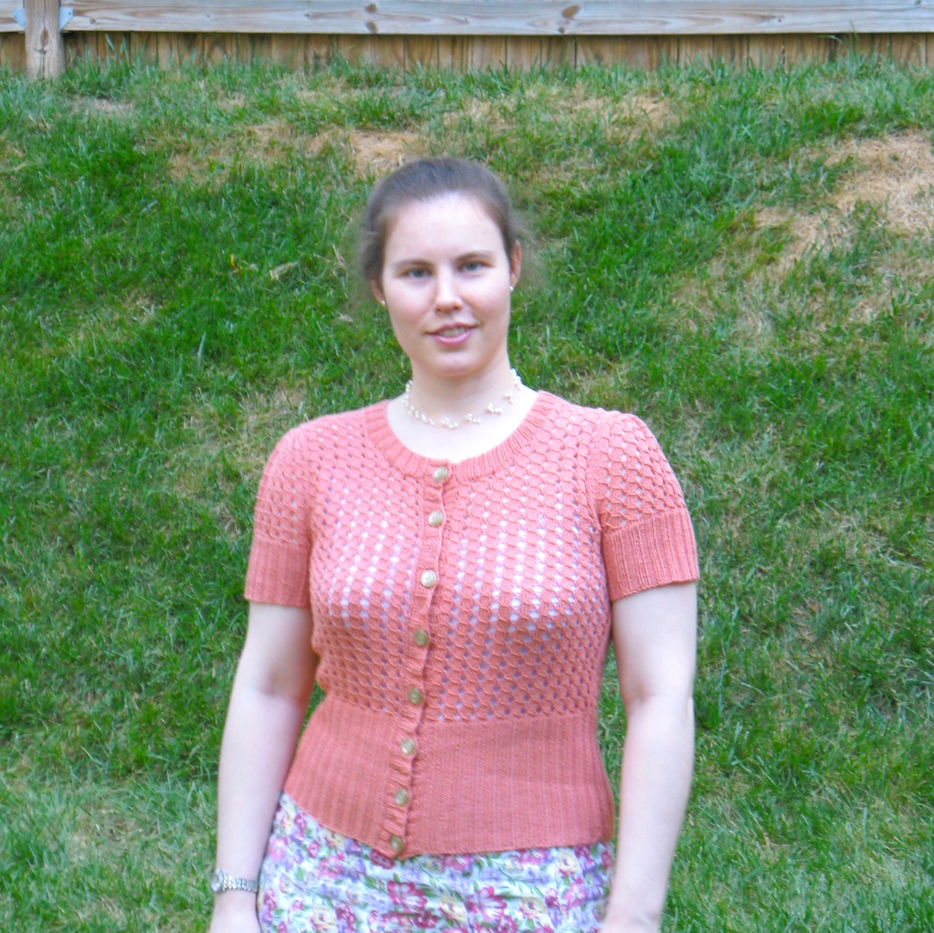 The pattern is fairly simple, no errata. I made a few modifications: I added an extra stitch to all the pieces above the ribbing, obtaining an odd number of stitches, so that the stitch next to each selvage stitch would be stockinette. I did this so I wouldn’t have to seam or pick up stitches next to the yarn over eyelets. I also disregarded the directions re: how many stitches to pick up for the bands. I picked up stitches on a 1:1 ratio across horizontal edges, 4:5 ratio on verticals, and eyeballed on the curves. I ended up with significantly more stitches than the pattern directed. The buttonband has a tendency to gape, so I sewed snaps in between the buttons. Also, I did a line of slip stitch crochet on the top and bottom of the buttonhole band, to make sure the edges were even.