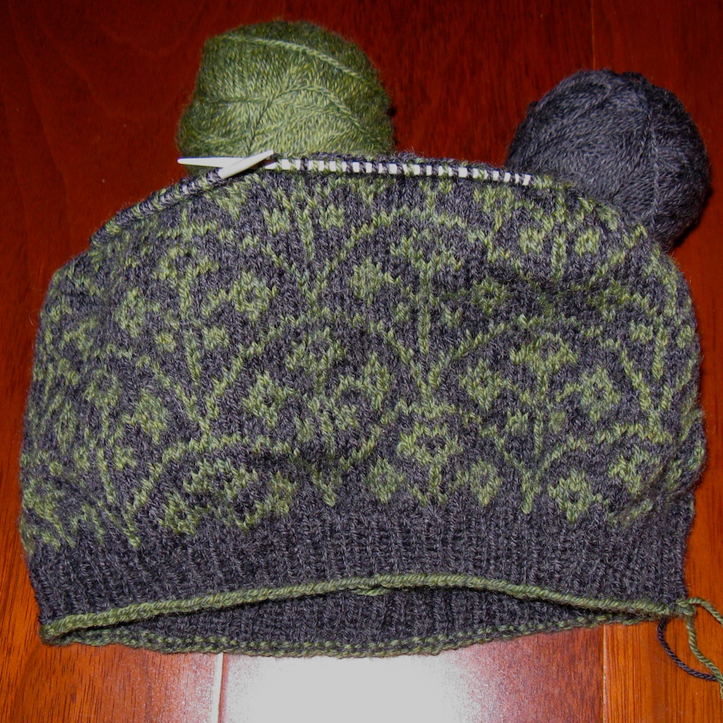 1. Selbu modern hat- about 40% complete when I picked it up, now about 70% after doing several rounds each day. This is really fun to work on and shouldn’t take long to complete, but for some reason it just hasn’t kept my attention in the past. About 30 rounds to go; soon I will begin decrease shaping for the crown!