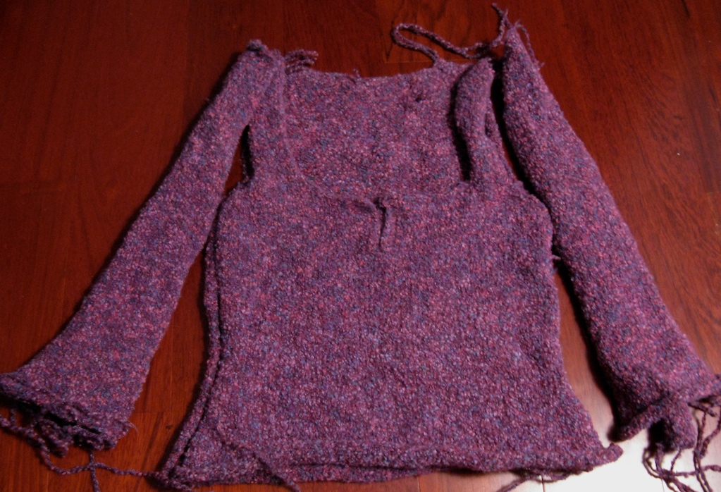 3. “Bruyere”-needs seaming and buttons. Knitting this was fun, but the crochet finishing with the splitty, sticky boucle yarn was pure torture. Nevertheless I spent a few hours last Saturday to complete the crochet around the neckline. The texture of the stockinette fabric completely disappears in the boucle, and conventional seaming would drive me batty, so I plan to use a zig zag stitch on my sewing machine.