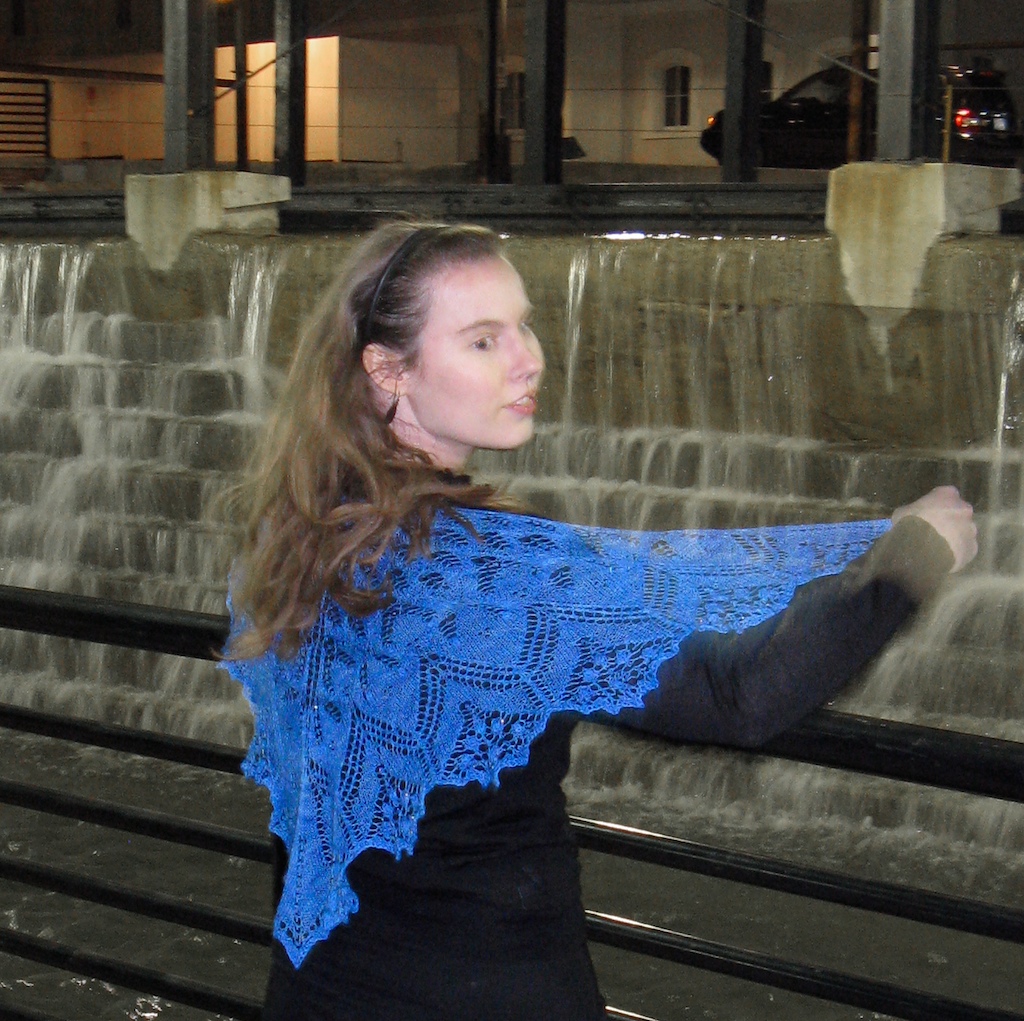 I really adore the yarn, which was dyed in a lovely semisolid blue “Perception & Depth”, a shop-exclusive colorway to a cool LYS in Apex, NC, Downtown Knits. The yarn is incredibly soft, with a lofty quality that may remind one of a floating cloud. It has a delicate sheen, excellent color saturation and even in the open lace, provides plenty of warmth. I’m no pro on laceweight yarn, but I have used a few, and this yarn is rather thin, though cetainly not weak. I started on US 5’s, but decided to redo on 4’s as the fabric seemed a bit loose on the larger needles. I only used 30g of the 50g skein so I have enough leftover for something small like a cowl. The beads, a darker cobalt, are from Beadazzled in Cary, NC.