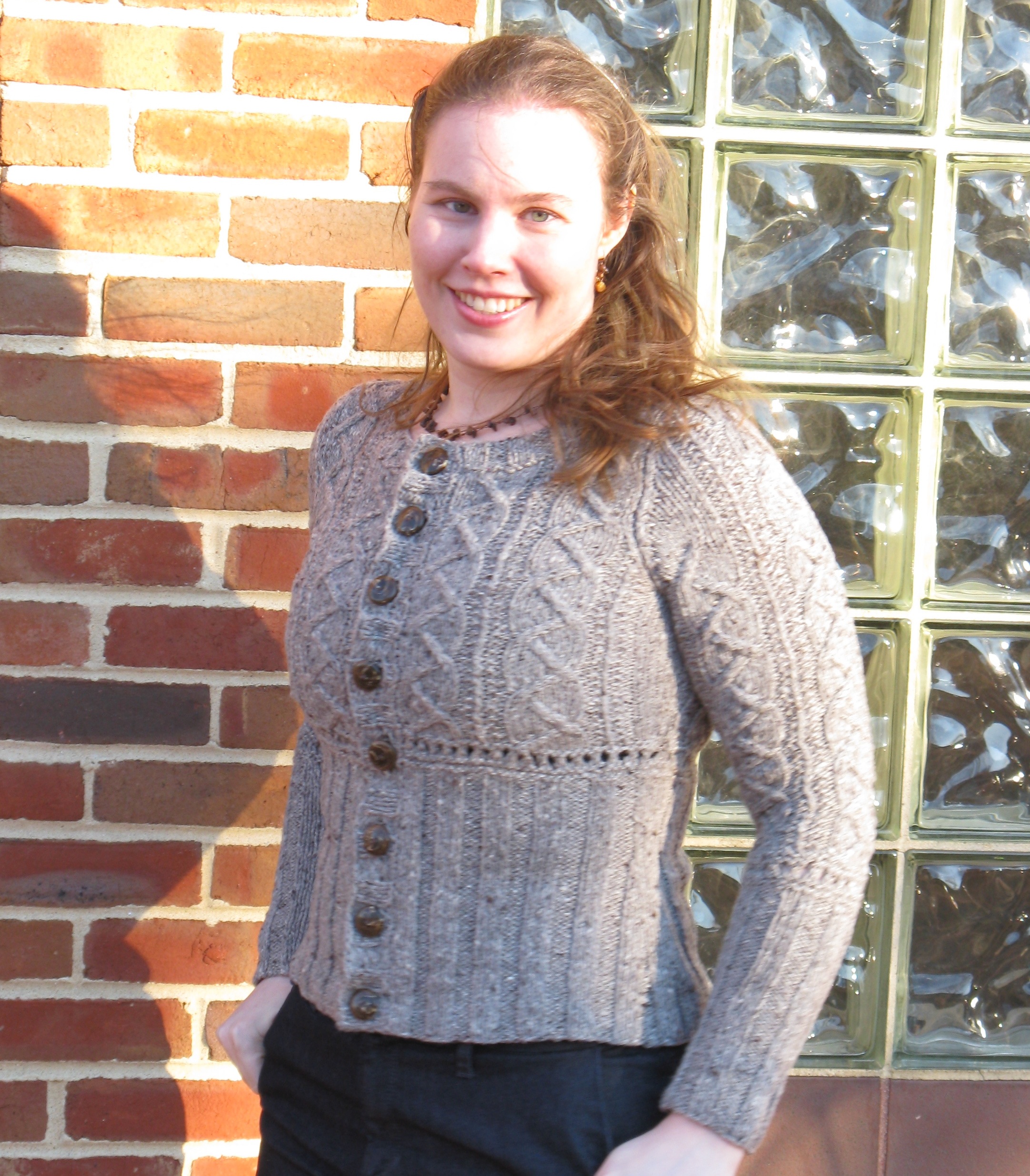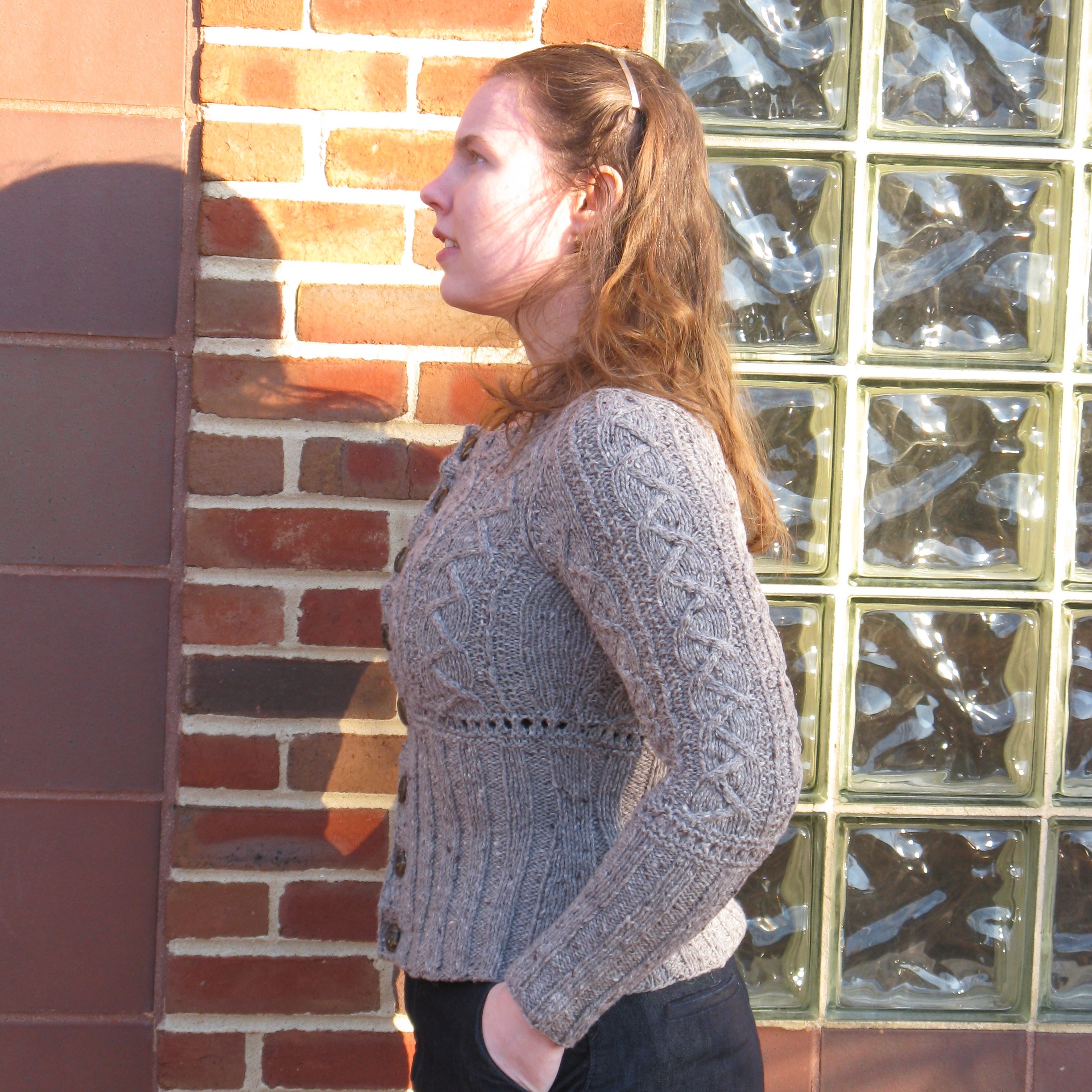 This sweater languished a long time in the finishing stage because I was frustrated with the gaping buttonband. Finally I sewed some snaps in between the buttons on the top half, and voila, success!