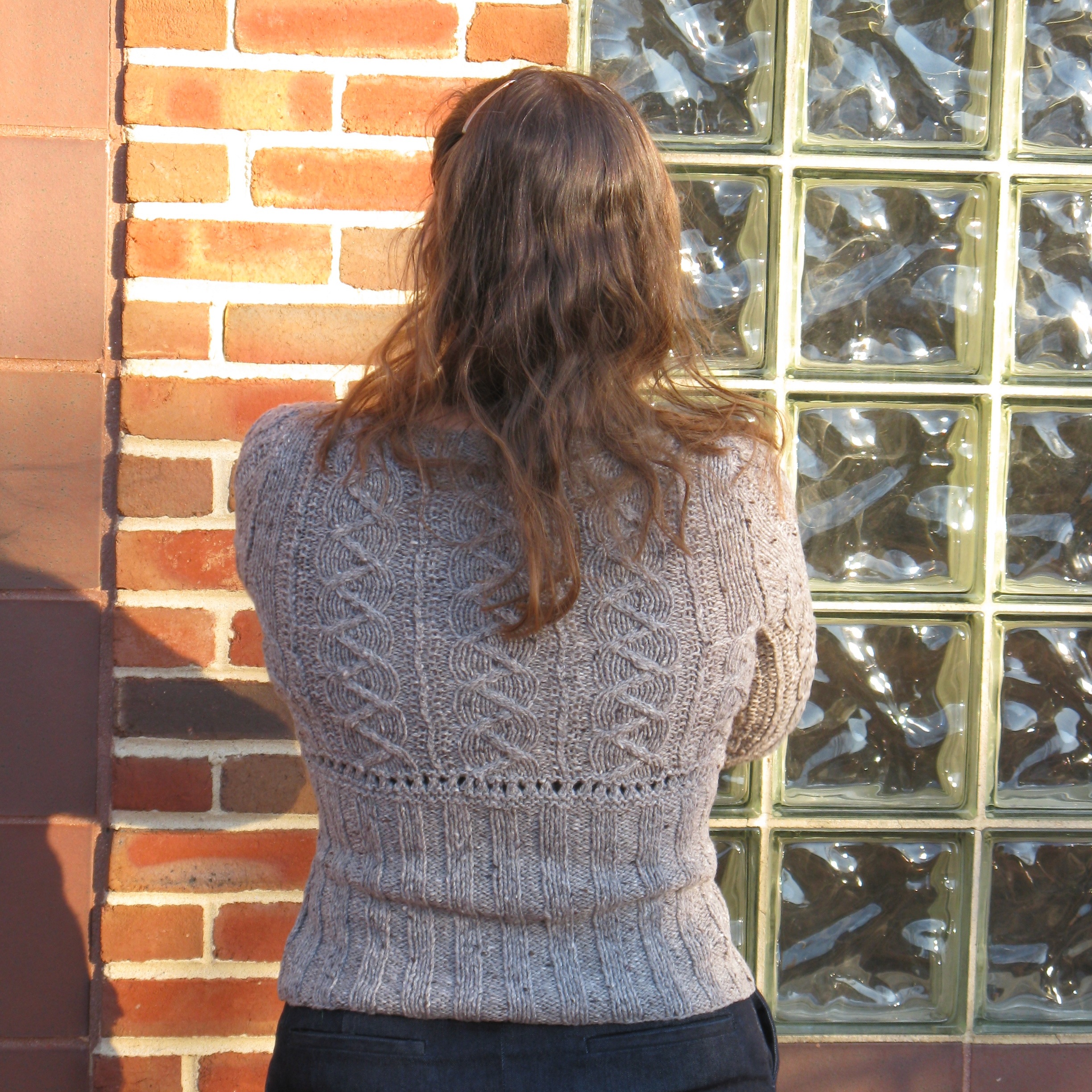 A modern and feminine interpretation of the traditional fisherman sweater, this project was fun to knit and I’m happy with the FO, it should have high wearability, given the neutral color. And it is warm, though perhaps not suitable as outerwear in 8° F windchill. If I look strange in the photos, the weather is the reason!