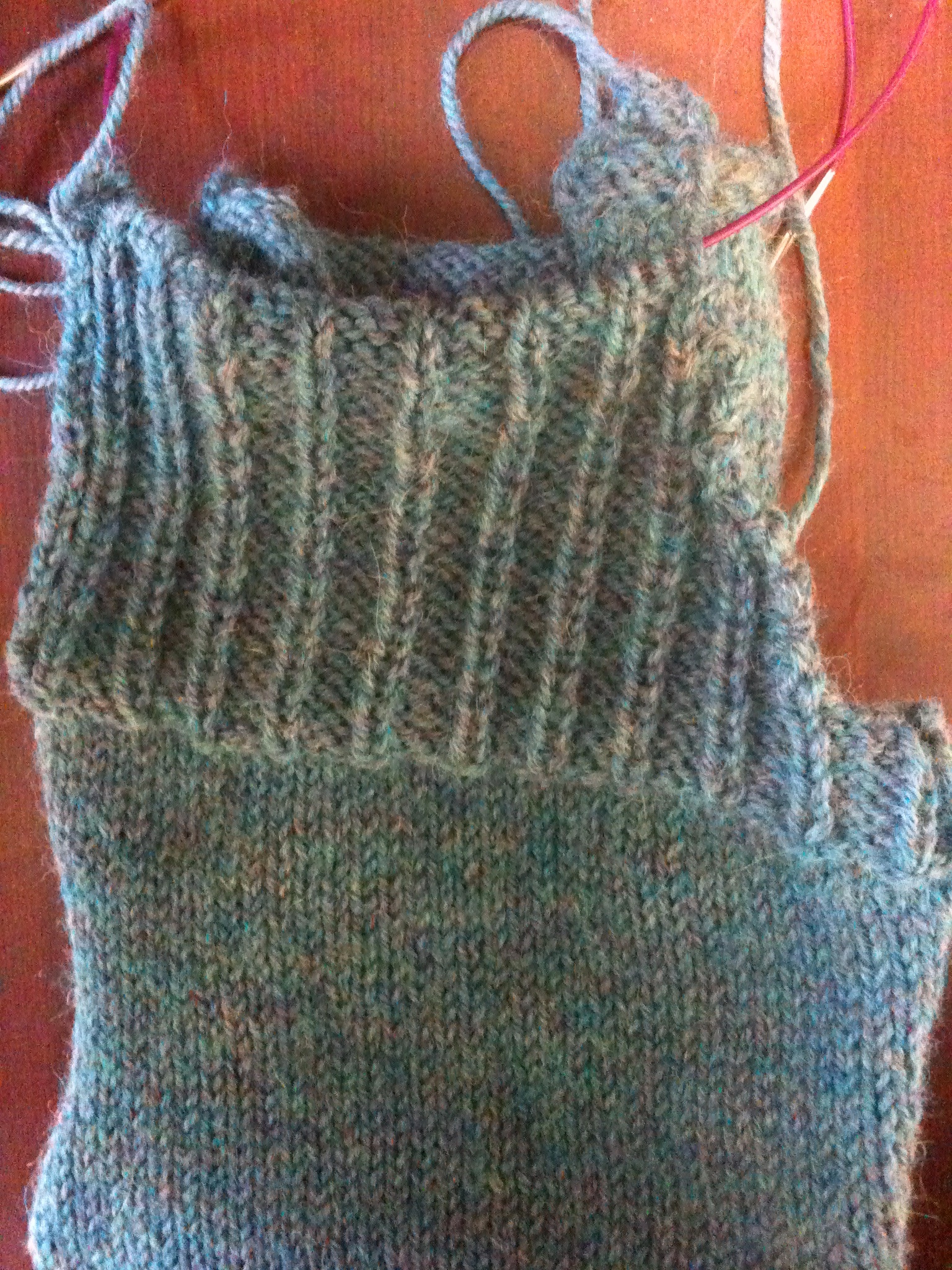 The Ursa pattern by Berrroco has been on my queue for years. I dithered over color choice for a long time (Ultra Alpaca comes in so many gorgeous heathered “mix” colors!), but when the Dizzy Sheep offered the beautiful “Cerulean Mix” (turquoise heathered with pink) during their Labor Day 2010 spinoff, and I had a coupon code, well, resistance was not in the cards. I’m fussing with the sizing a bit, as I like Ultra Alpaca at a gauge of 5.25 and 7 rows per inch. So I’m knitting the medium size at my gauge to end up midway between the small and medium. This sweater is knit in pieces so it should be a good carry along project for quite a while yet. Pictured here is the left front, with the armhole shaping just completed. The back and first sleeve are also done, and I’ve used half the yarn. Hopefully I will have enough- this sweater has a big floppy collar and thick buttonbands.