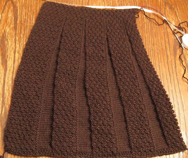 knit) to ask what I should cast on. She suggested a skirt. Indeed, I had bought 4 balls of Valley Yarn Northampton when it was on sale last October, destined for a skirt project. I chose the Carnaby pattern as it is cute, the pattern is free, and with copious amounts of moss stitch, it counts for the current SKC KAL (theme=”texture”). The pattern is dead easy, the construction novel (it knit sideways), and it knits up quickly, but it turns out that with all the moss stitch, this project is a bit of a slog. The dark brown color will be great for my wardrobe but it’s not the most interesting to knit. So, to break up the monotony, I cast on something new….