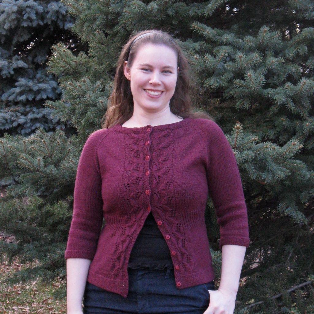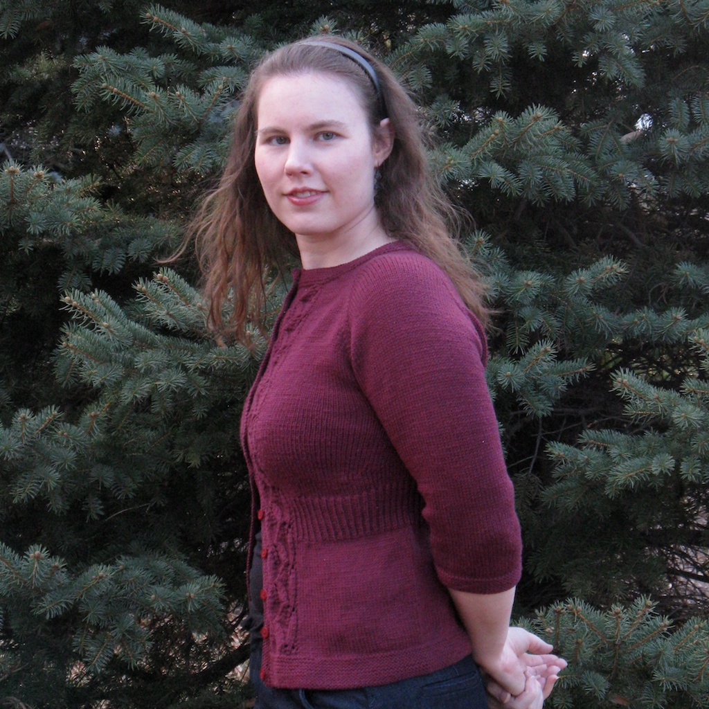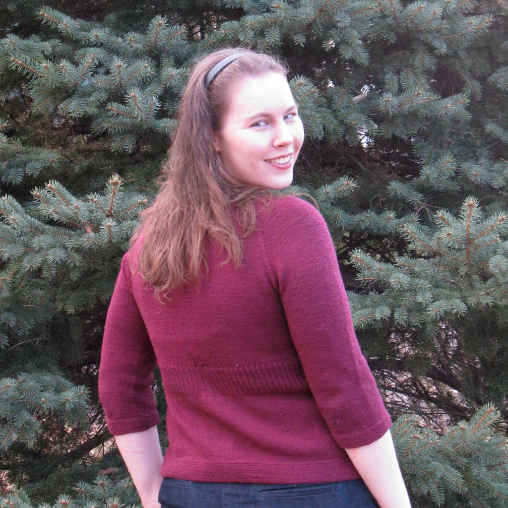 The yarn is Valley Superwash DK, an extremely soft and luxurious merino, four ply construction with a nice plump, round twist. The color is a lovely rich burgundy. Pilling is to be expected with something this soft, but I knit it at smaller gauge, and pilling has been minimal after several wears. There were a few irregularities in the yarn (loose tufts of fiber), but for the most part, it was like knitting with butter. When the yarn arrived in the mail, back in January 2010, I happily marveled at the softness, and the finished project does not disappoint. Also, it blocked very nicely after a soak; didn’t grow much, if at all.