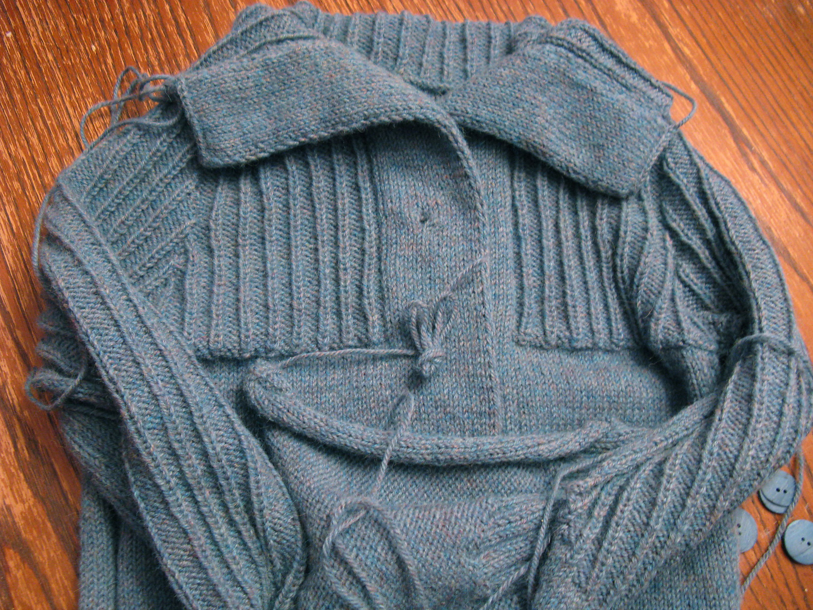 was willing to part with some yardage in the same dyelot. This project has a ton of finishing- the normal seams one would expect with a sweater knit in pieces, plus seams up the center front to apply the buttonbands. However, it is worth it- I love the coziness and stability of the double-layer bands. 3 buttons are required to fasten the yoke portion; I found some nice ones at G St.