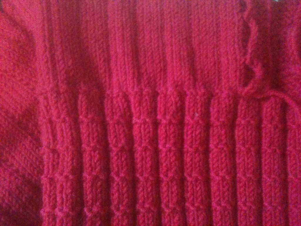 in Radish. This is pretty much a perfect red in my book. It reminds me of hearts, cherries, vampires (blood), and love. Forgive the dreadful iphone photography, but you get the idea. The color is off- imagine a bit darker, more saturated, blue-ish understone. I swatched for the Lace-up Pullover, from Classic Elite’s Sunday Brunch booklet, and had to go down a needle size to get gauge in each stitch pattern. Despite the small needles and textured stitch pattern, it proved to be a fast project, with the knitting clocking in at under 2 weeks. The vintage style is really adorable. I fretted about running out of yarn, first because I added length to the body, and again when I somehow lost a partial ball; it disappeared on the Metro. Remaining to be done is seaming, weaving in ends, and blocking; already purchased is some gorgeous double-face satin ribbon to lace up the front. Speaking of which, “Lace-up Pullover” sounds so prosaic, eh? Henceforth, this will be known as “Vintage Heart”.