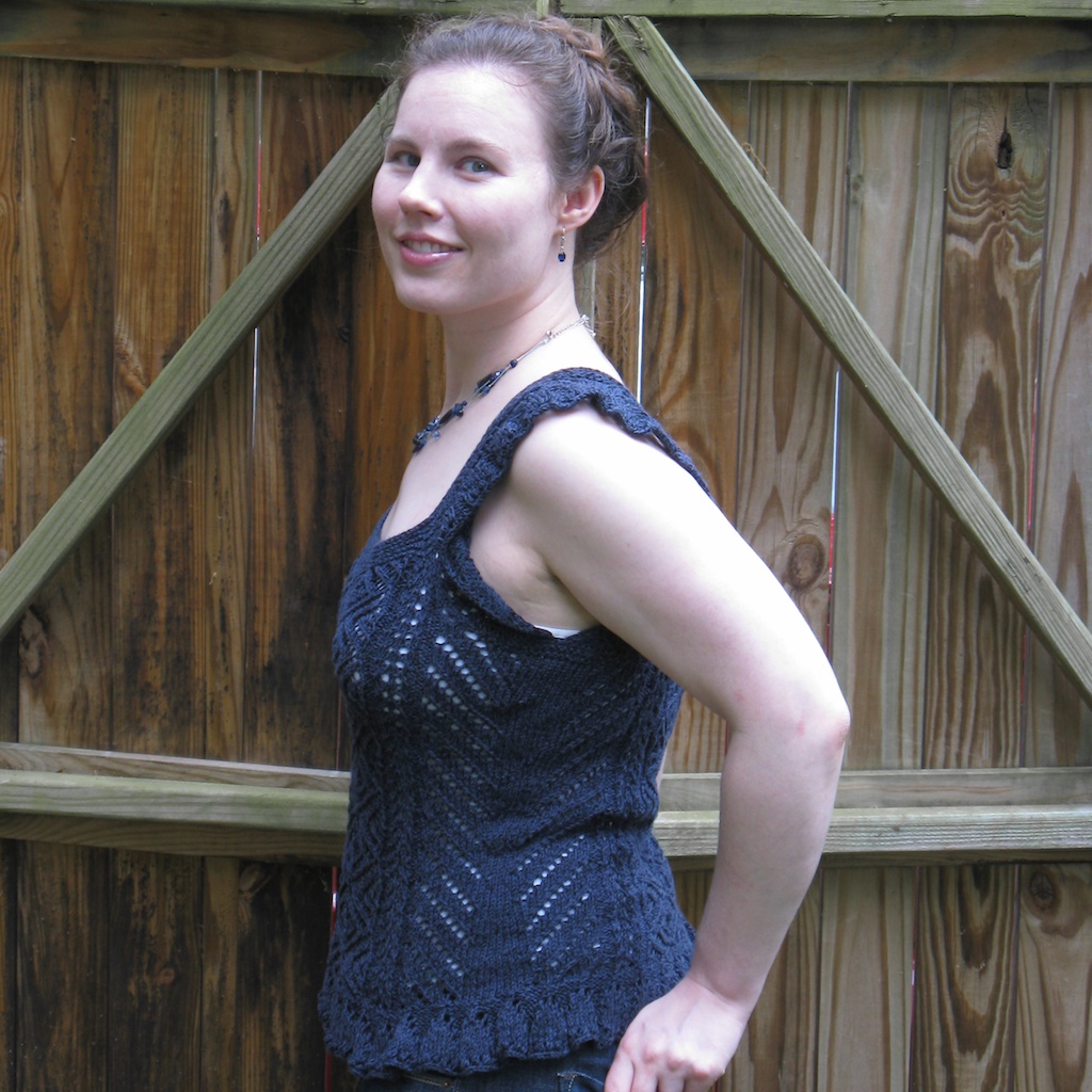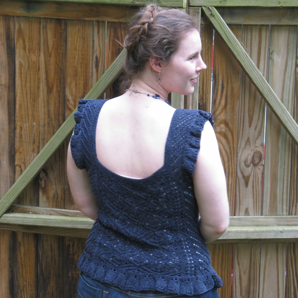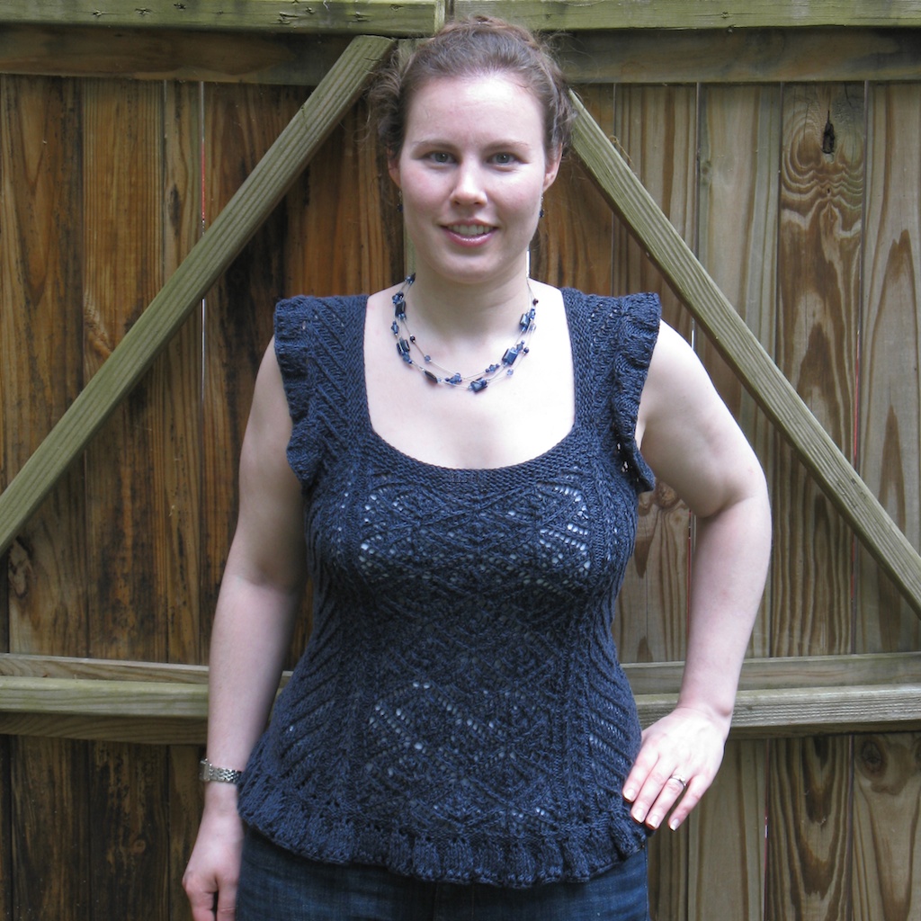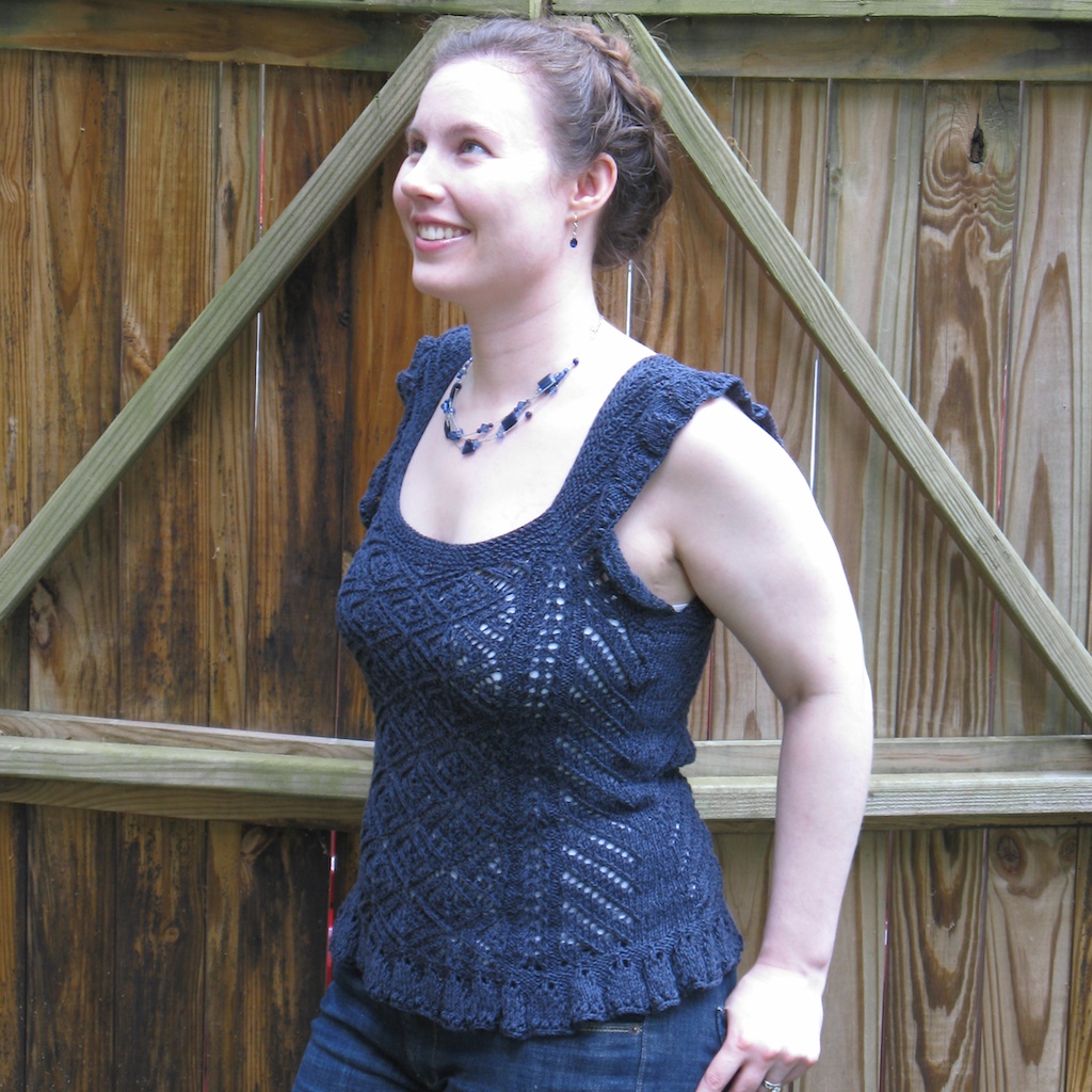 I love the deep square neck, geometric lace, and flirty ruffle trim. The lace patterning does require some concentration, but it is completely worth it!