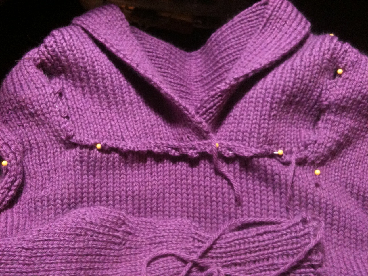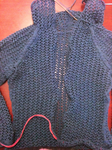 I cast on Laika mainly because I wanted to use this yarn, Knitpicks Gloss, that has been stashed since 2006. It’s a nice yarn and works great for this pattern, the silk/wool blend providing drape and spring for the simple lace pattern. I won’t lie, with a row gauge of 8, this project involves a lot of knitting and is somewhat tedious, but at least the pattern is easy. The sweater worked up pretty small, but I’m counting on growth during the blocking phase, both to open up the lace and the yarn should stretch, due to the silk content. The pic above is a bit dated; I’m now at the stage where I need to weave in ends, block, and sew on buttons. Of which there are 20, egads!