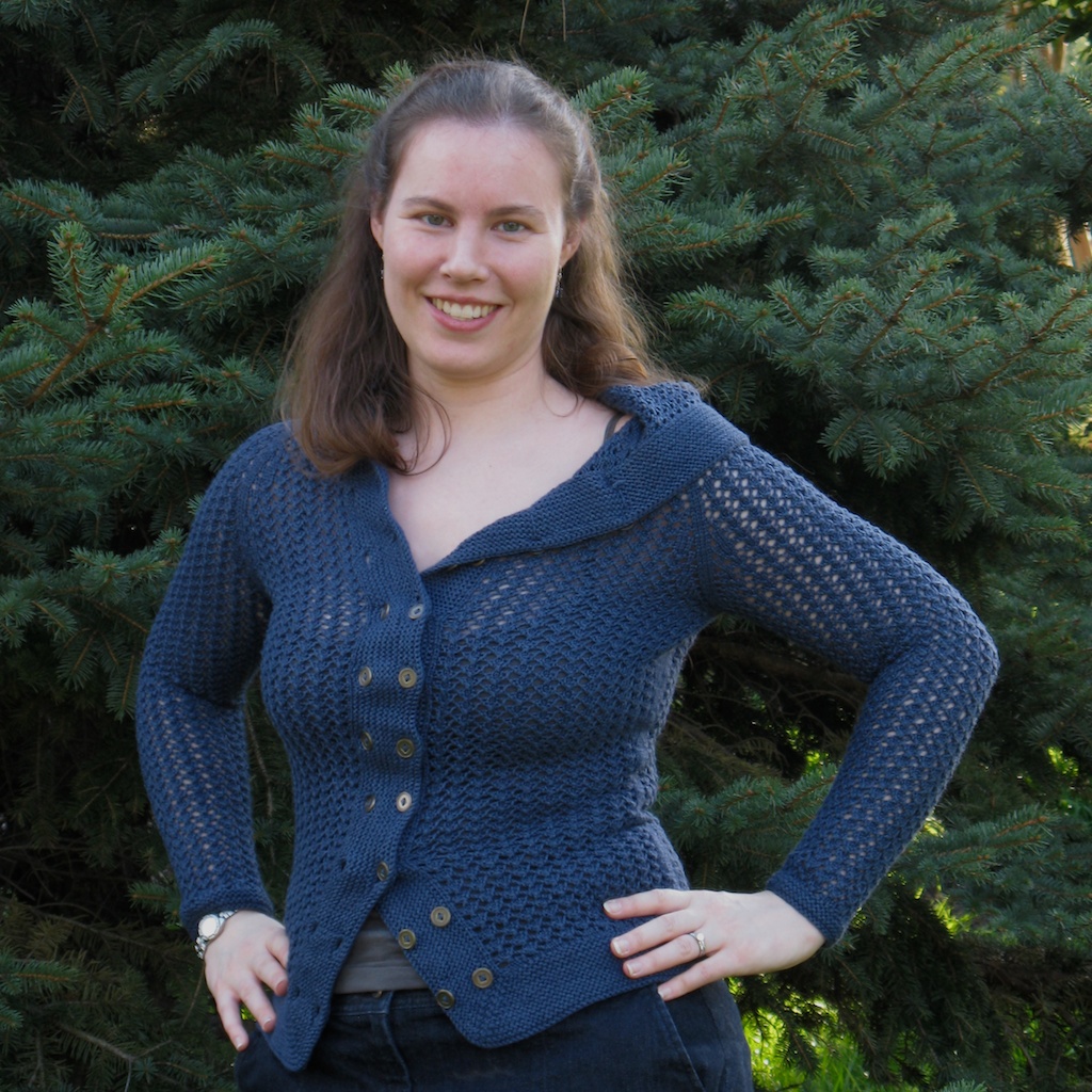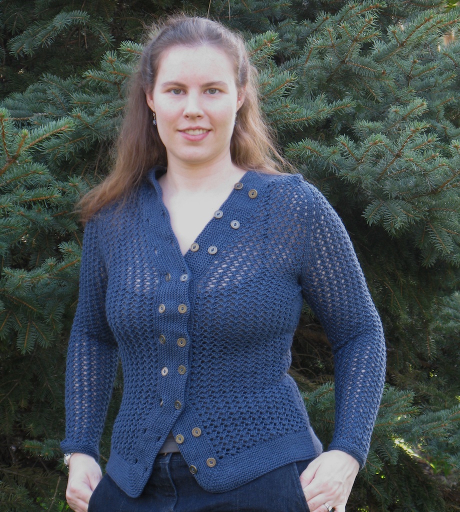 The yarn, Knitpicks Gloss (70 merino/30 silk) was purchased in 2007, I believe, making it one of the oldest yarns in my stash. I still have one skein left, but I’m greatly pleased to have used seven skeins. I’ve used the DK weight gloss before, but this was my first experience with the fingering weight, and I really love it. It’s soft with a subtle sheen, four plies with great firm twist, easy to knit by touch alone. The color is great, a greyish blue, almost neutral. This yarn was originally purchased for “Thermal”, but I never knit that pattern after reading many horror stories re: the fabric growing out of control after blocking/wear. I imagine this is a function of the stitch pattern, because my sweater didn’t exactly grow during the blocking phase, but it easily stretched to size. One small nitpick- it wouldn’t spit-splice. I don’t really understand why, as the yarn is 70% wool and labeled “Hand wash” but perhaps the merino was superwash. Nonetheless, I really enjoyed the yarn and I picked up another 4 skeins in “Bordeaux” for a cape project from “Vampire Knits”. Gloss is my favorite yarn in the Knitpicks line and I love how it’s offered in various weights now. Buttons are antiqued brass, from G Street. The 4 stitch buttonholes came out a bit big for the buttons, so I might tighten up the edges with some thread.