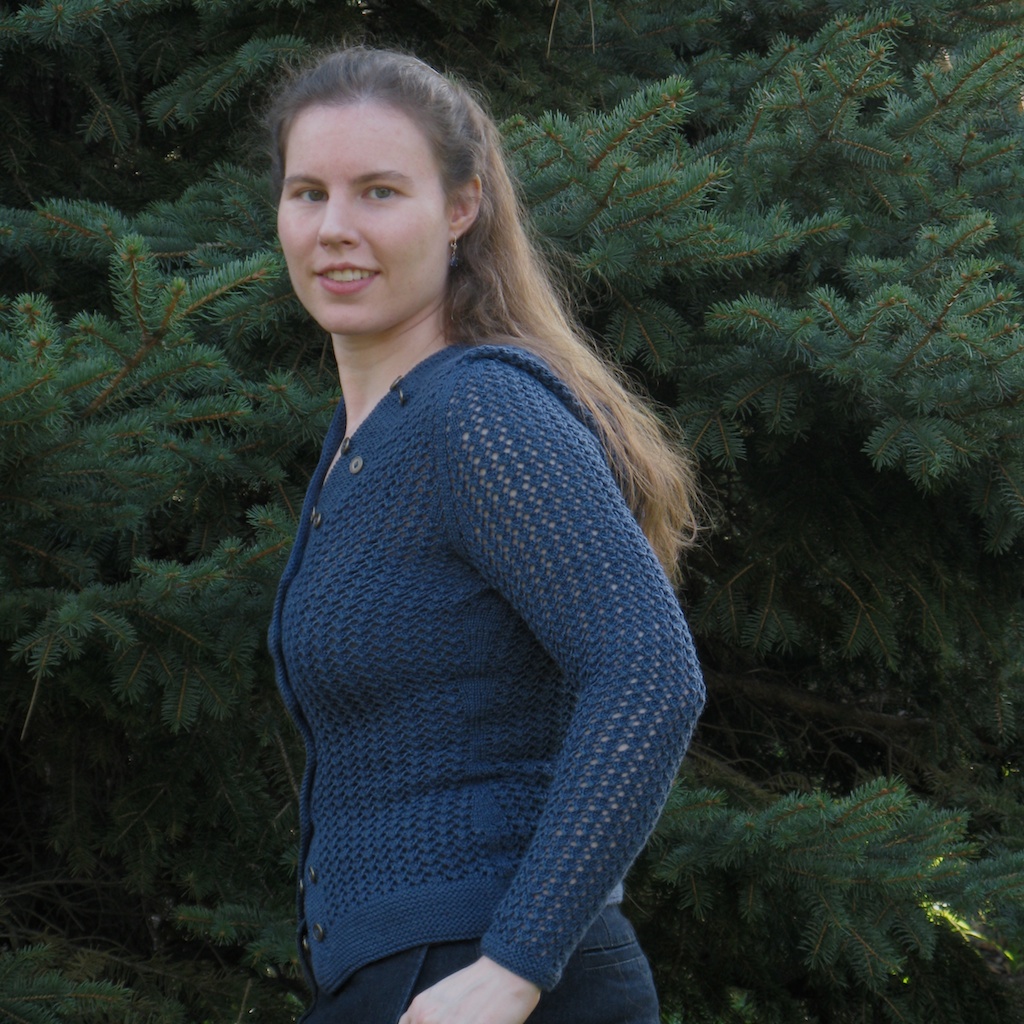 The pattern is well written, no errata. The lace pattern is simple and easy. Probably the biggest challenge is boredom… this involves a lot of knitting. Thank goodness there is some shaping to break up the tedium. And no, the shaping isn’t terribly challenging- Ysolda spells out exactly how to handle it and it’s a small (3 stitch) lace repeat anyway, which makes things easier. I knit the sweater on a 24″ needle and then switched to a 40″ for the edging. I managed, but knitting that edging (20 rounds of garter stitch)- all around the hem, up each side of the front and around the hood, was pretty miserable with the stitches packed so tightly on the needle. If I were to do this again (yeah, right!), I’d use a longer needle or several circs to knit around as if on dpns. I do like the aesthetic of the garter stitch trim. Lace doesn’t need to be fussy, and this pattern is the perfect example of a simple, geometric lace pattern creating a streamlined, modern look.