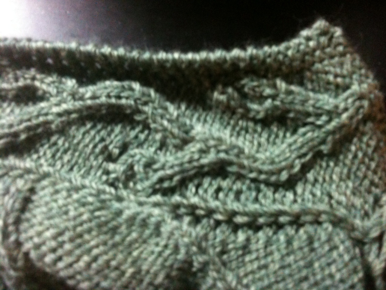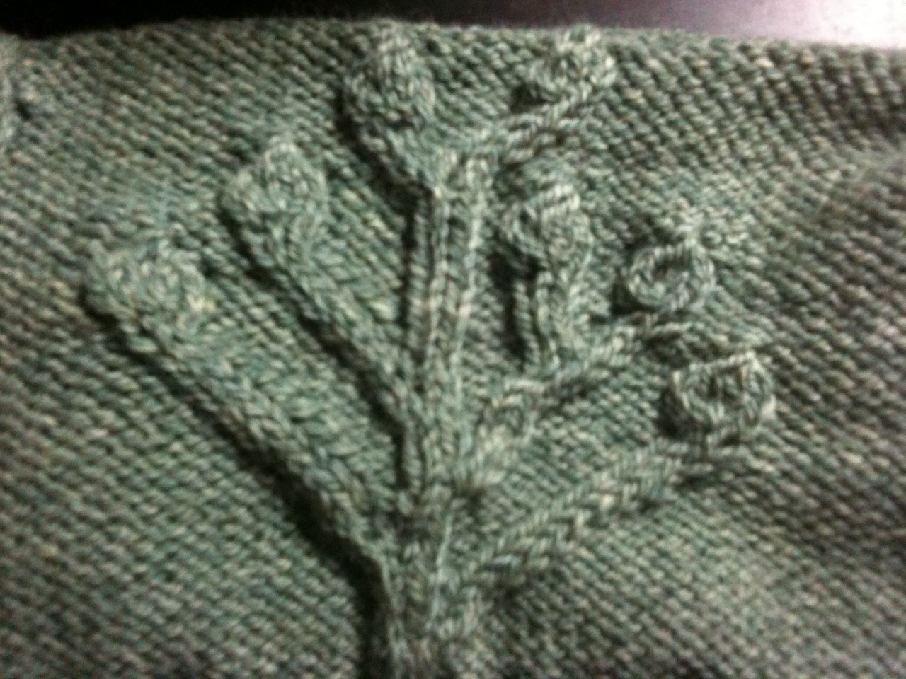a real treat… wonderfully soft, lovely heathered color (it comes in solids as well). It’s a light worsted weight in my opinion and I like it at 5.0, so I knit a few sizes up to compensate (the pattern is written for 4.5 spi).