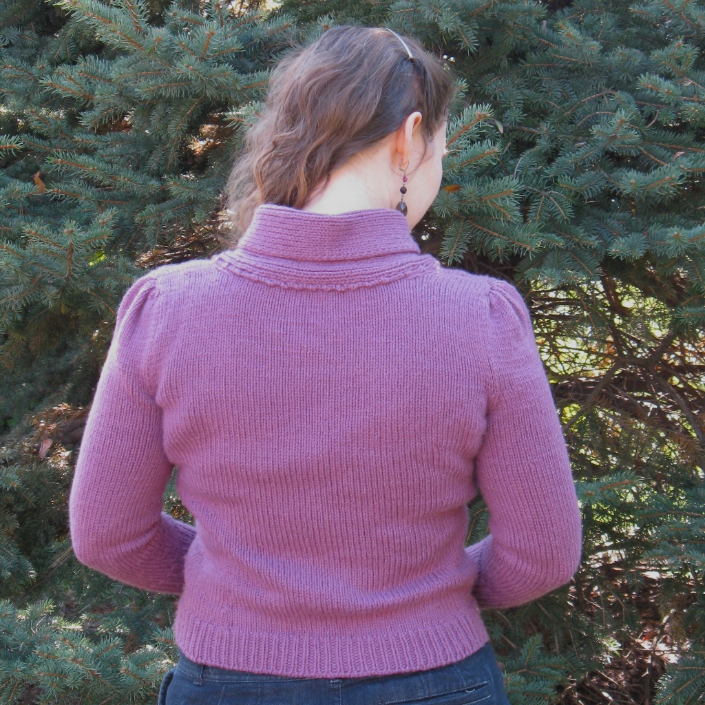 I’m quite pleased with this project; it was a quick knit, feels wonderfully soft against the skin, and is especially cozy with the full collar. The style has a demure, retro vibe that is quite fun to wear!