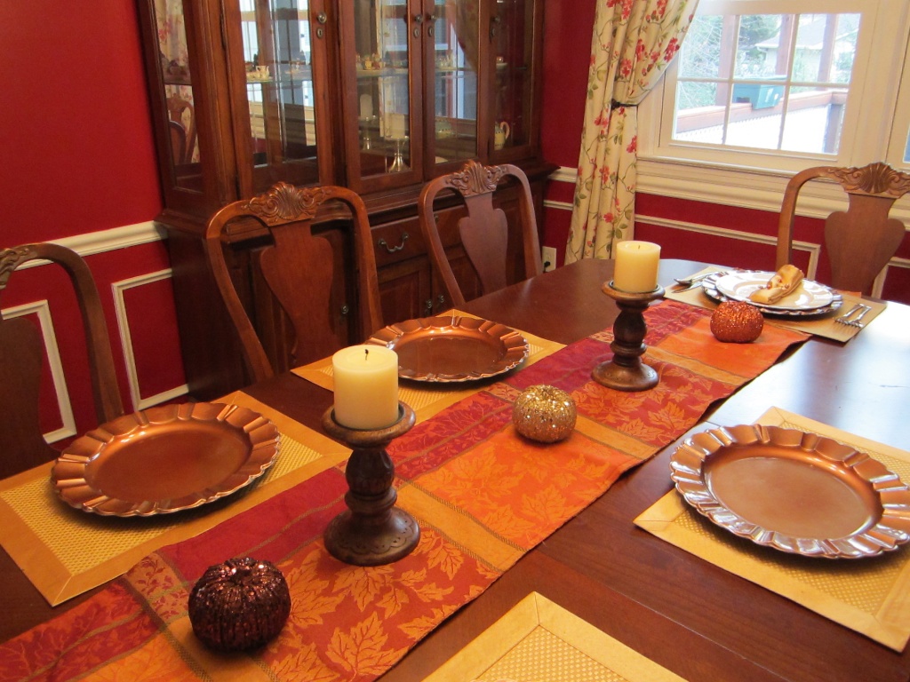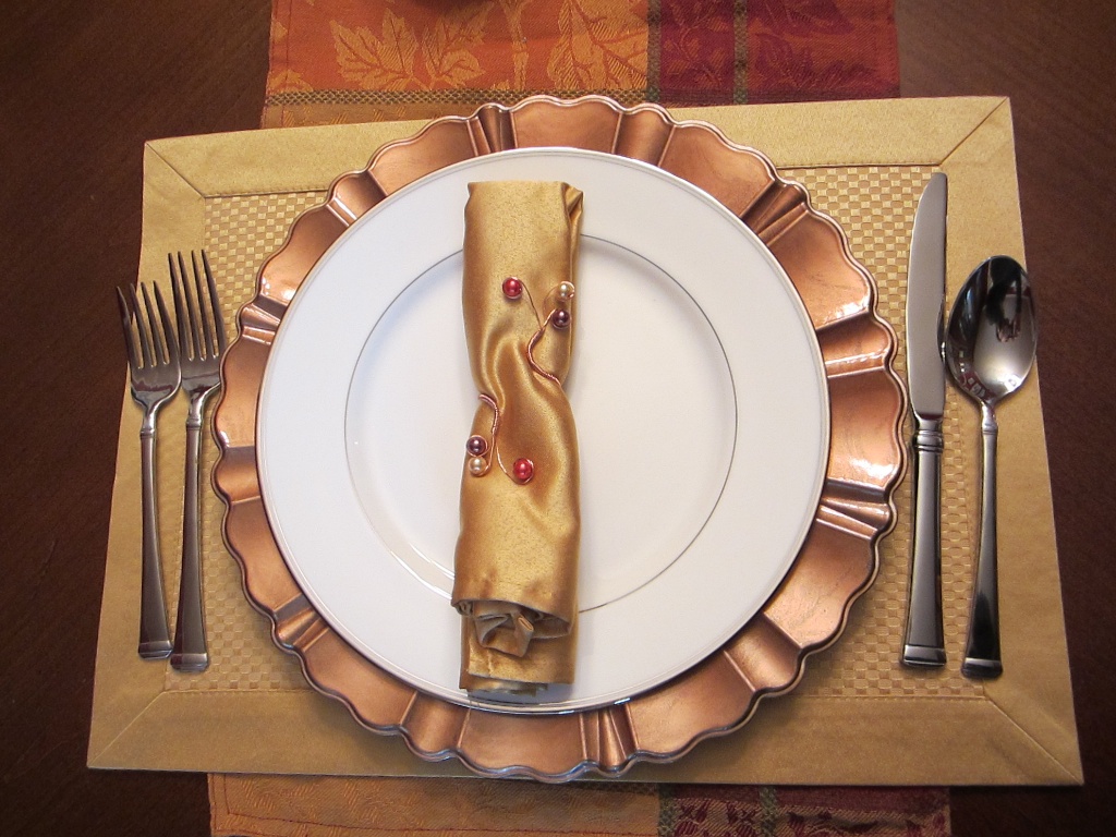 My table settings are only a bit crafted, but I am proud of how it all came together. The runner I had from last year; it is the Montvale pattern (sorry no longer available it seems). I arranged three sparkly pumpkins along the runner (purchased from a craft store) and set 2 dark wood candleholders with pillar candles in between (from World Market). The gold placemats and napkins are from Bed Bath and Beyond; the chargers are from World Market. The china is from my wedding registry, Mikasa “Gothic Platinum”. Now for the crafted bit- beaded napkin rings, following this tutorial. The tutorial calls for 0.8 mm wire, or 20 gauge. I was only able to find a sufficient quantity of the copper color in 22 gauge at a rather poorly stocked AC Moore. Perhaps that was the determining factor, but my napkin rings are not exactly stable, you have to reshape them a bit when you slip them around the napkins. Also, the beaded “stems” at both ends are easily knocked askew (and easily fixed, I suppose). It is fairly time consuming, wrapping the wire tightly around for 12 cm for each napkin ring. So, I’d say the project is a mixed success- pretty but too delicate.