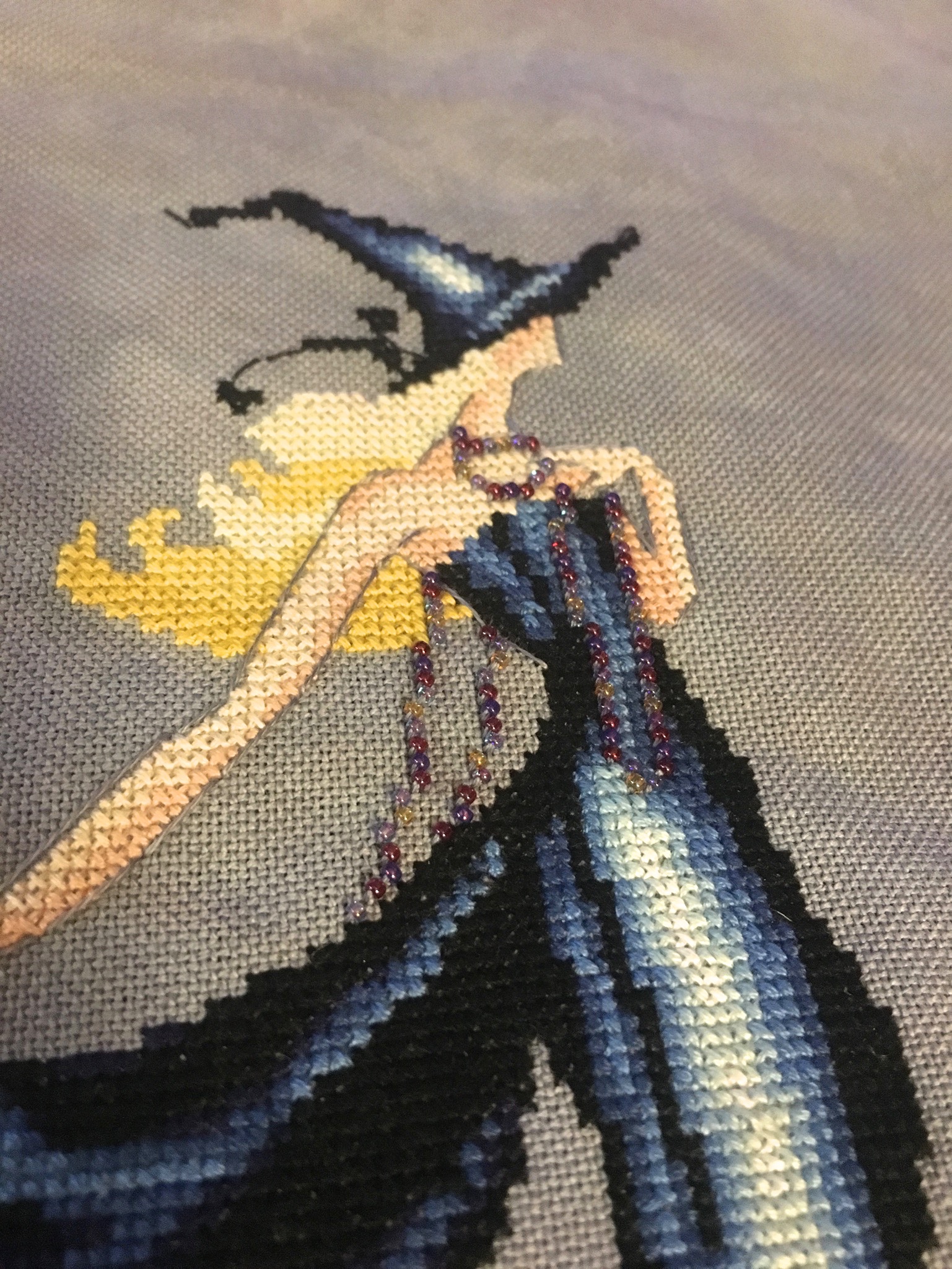 The beading was completed in one evening, about 2.5 hours of work. All the beads (except the extra large ones in the broom) are petites and they fit splendidly on the 32 count fabric. As for the large beads, I attached those with a full cross so they sit straight on the fabric. Most of the beads are charted in repeating color patterns, so I didn’t need to reference the chart too much.