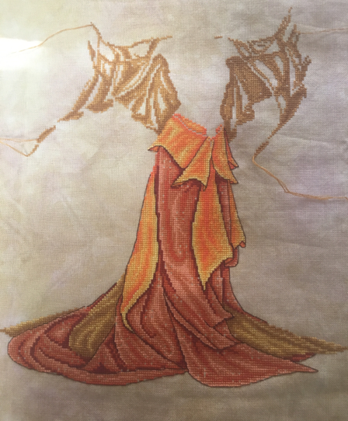 After 5 days (9 days total since last pic), I ran out of Kreinik… there is some more cross stitching to do, with Kreinik, (the fireworks all around her, necklace, hair decoration, plus backstitching the sun pattern on her gown, more backstitch on her face and arms.  Sorry for the weird pic, but she will be revealed in all her glory soon.