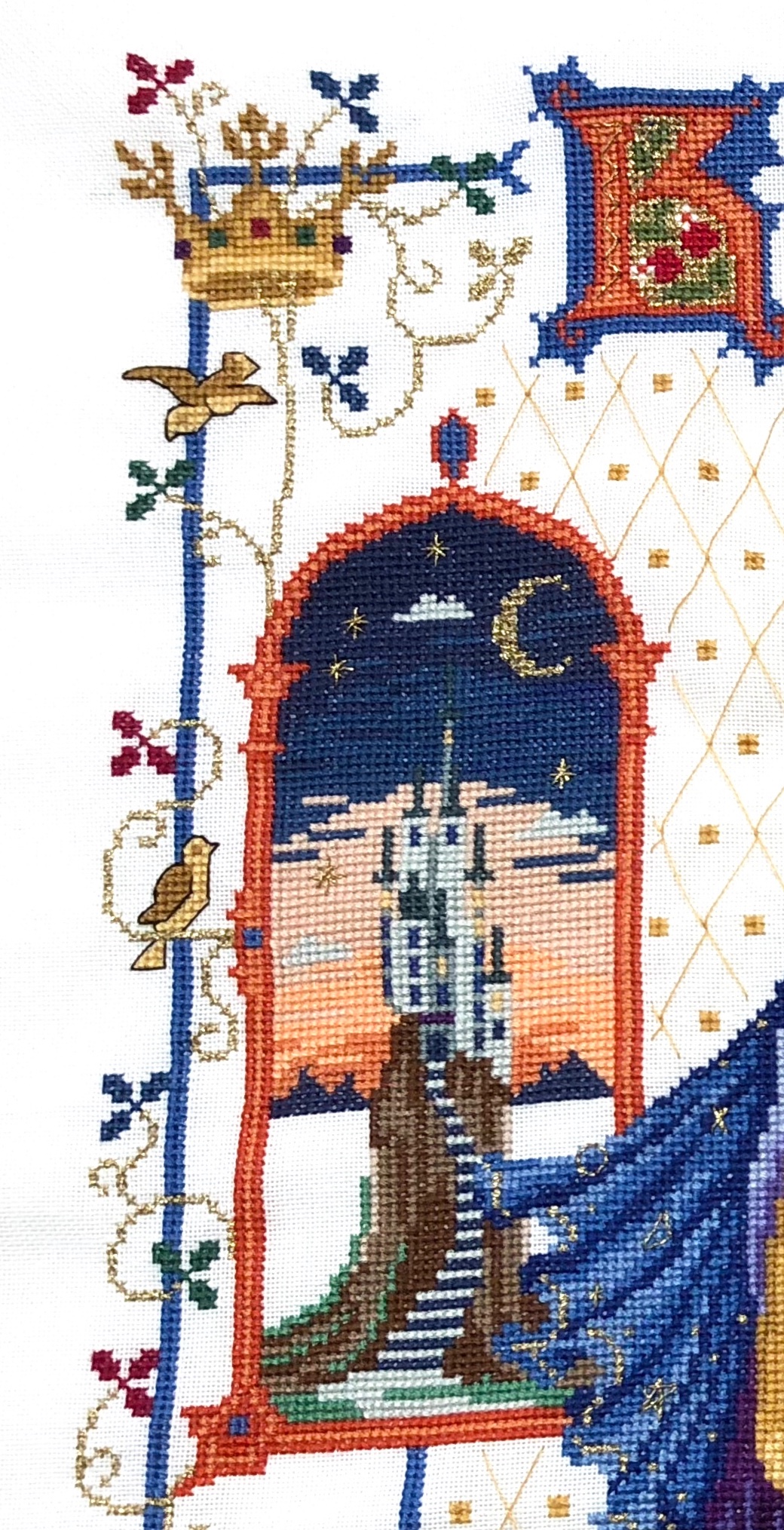 The pattern, by DMC, is fine, for the most part. The backstitch on Merlin’s lower hand is not charted. I did add quite a few fractional stitches around the chart so the backstitch lines would be neater. The directions say to longstitch the wallpaper pattern with one thread while you can see the model stitch was done with 2 threads. It is very difficult to make long stitch look good, over empty fabric, especially a soft one like jobelan. I wound up doing a lot of couching, at the intersection of the diamonds.