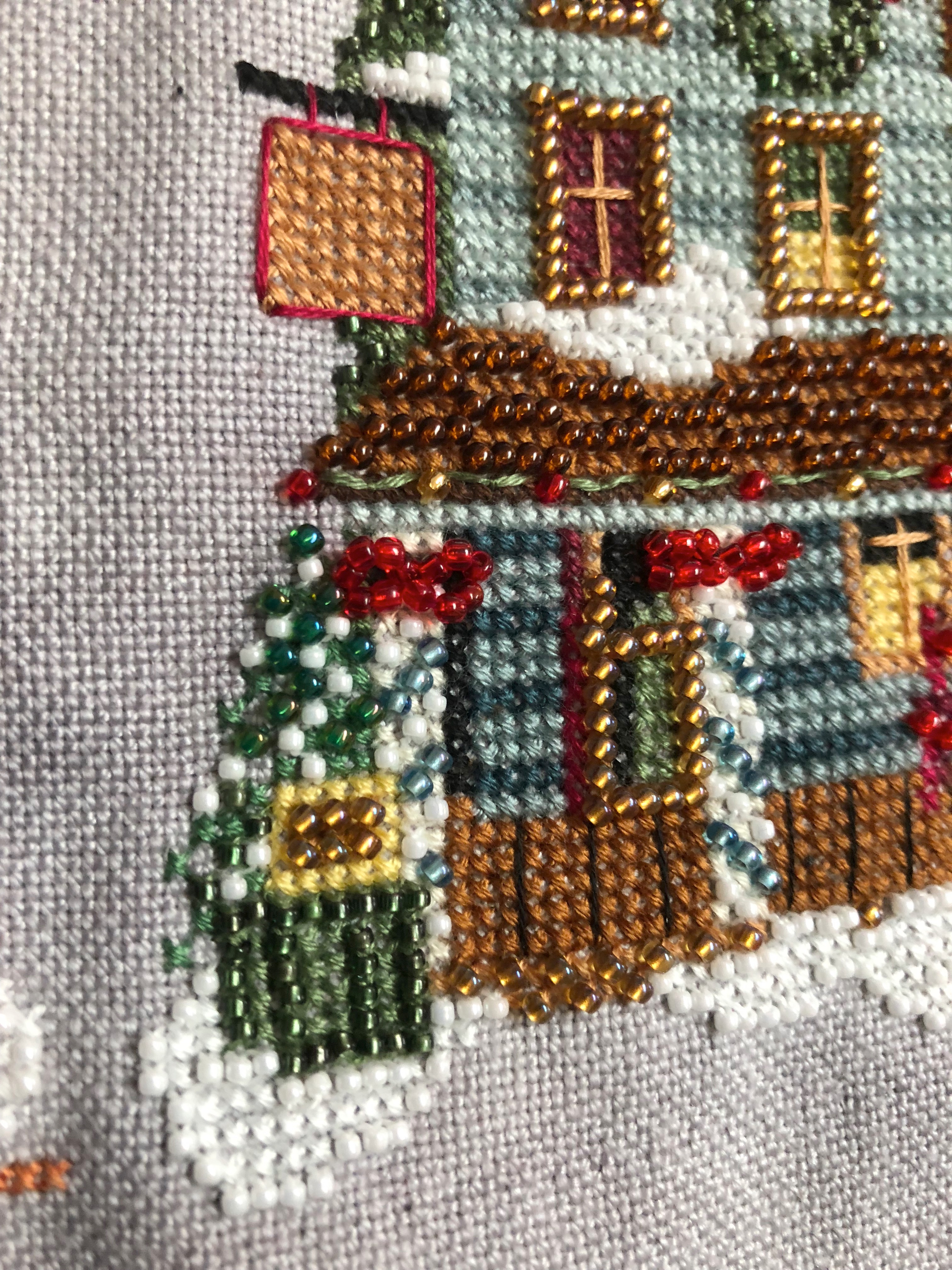 I felt like I got off to a slow start on this piece, but that was because I spent my first 3 day rotation starting the general store plus 3 other buildings! Hopefully I’ve sorted out the gridding and the other pieces will be easier. When I counted up the days, I realized it was a quick stitch. I actually had enough time on the day I finished to work on the snowflake border, too. So I did extend it down, as far as I could given how the fabric was mounted on the scroll. The middle row in the village doesn’t have much border, but I do intend to get ahead on the border this year, as much as I can.