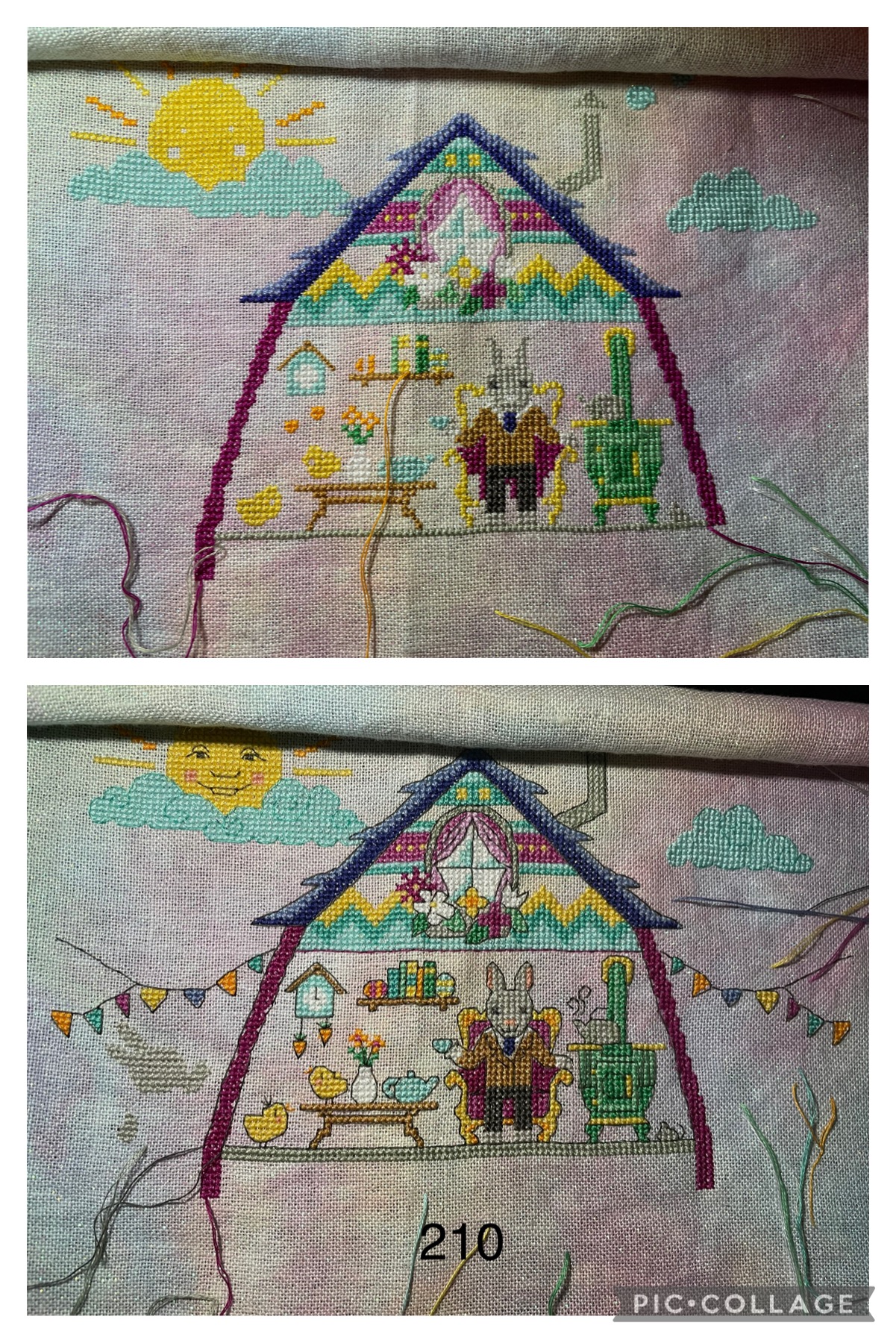 I started with Easter Bunny House, ultimately giving it 2 days and 1,472 stitches. I finished the cross stitch on the top floor and backstitched it all, starting at the top. I think it’s coming out so cute, the face in the sun, and all the detail on the stove, table, clock, books, etc. Finally I started working on the bunny that will be on a ladder, painting the exterior wall. I extended the walls down a little too.