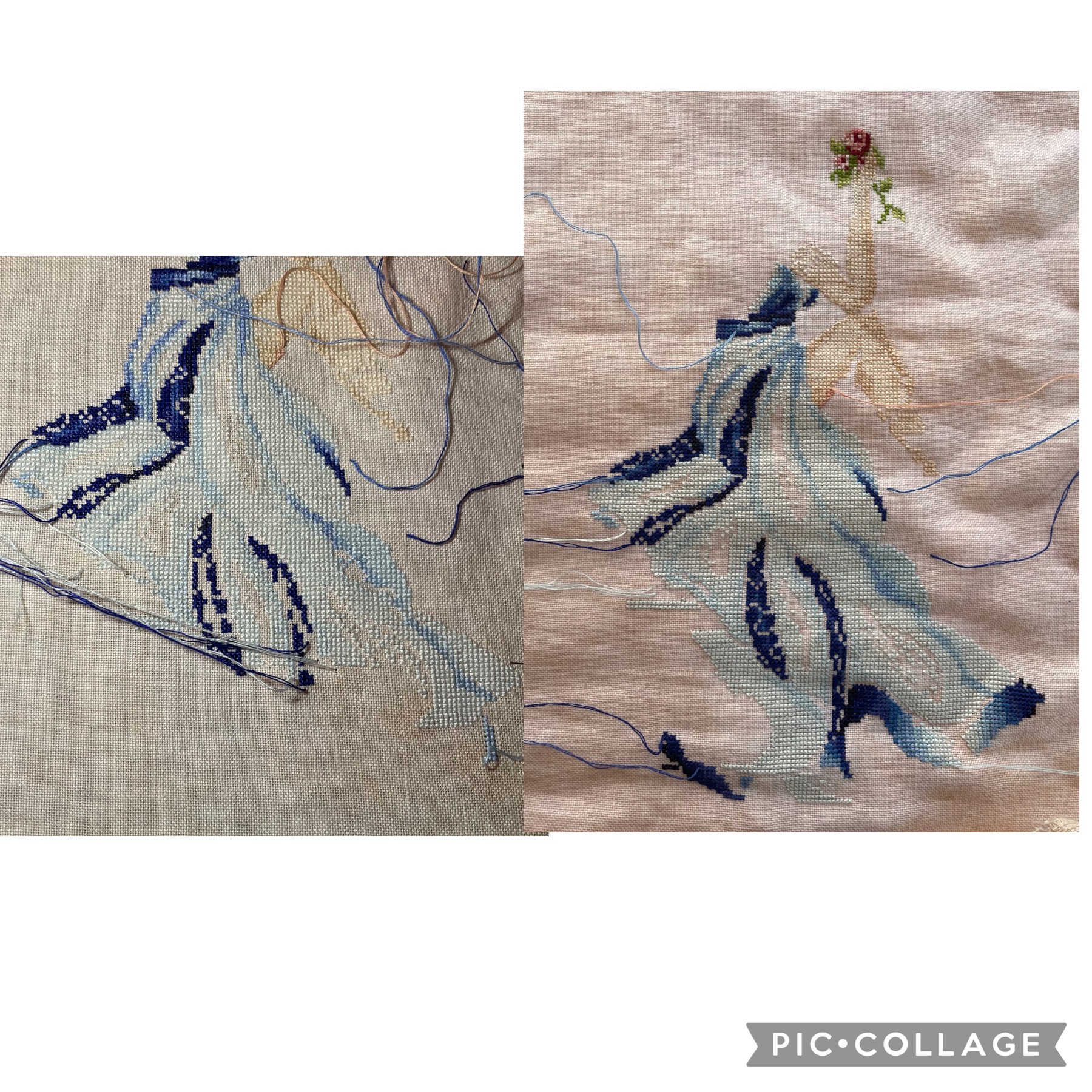 Fata dell’ Aurora had 1 day of attention and I did 1,330 stitches. I’m working on her skirt down to the bottom of the chart. She stitches quickly with long bands of color, though the hem involves more frequent color changes.