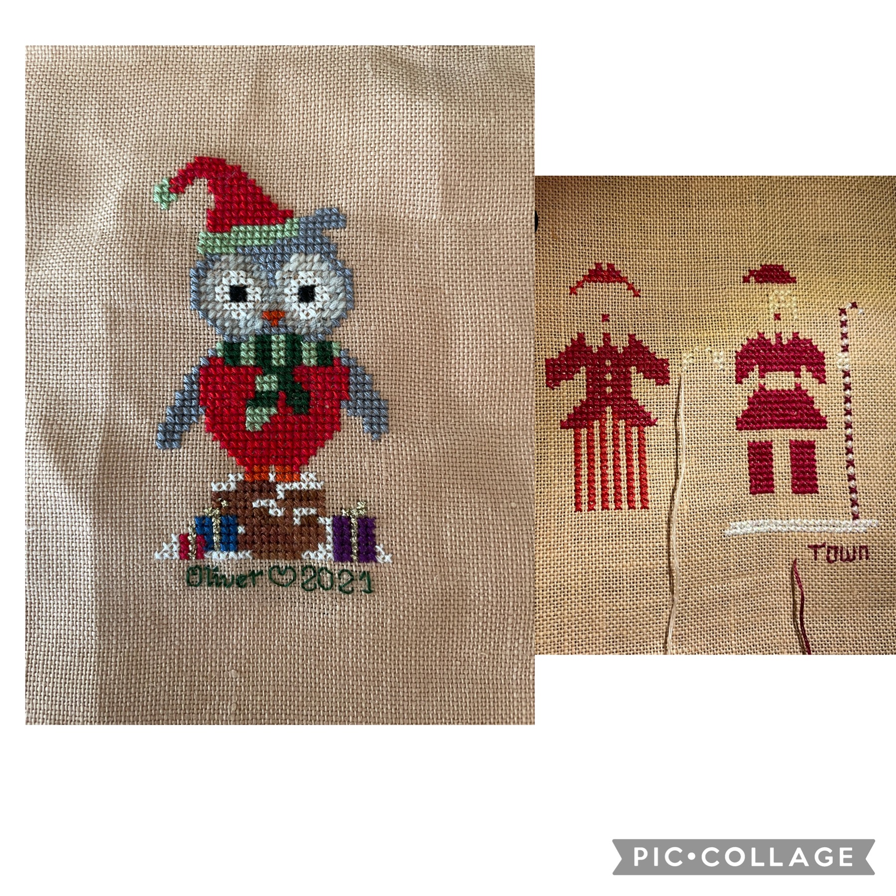 As for my ornie WIPs, Elfie Whoo was finished in a half (partial) day with 655 stitches. It’s modified with some of my own color choices, and a yarn ply (unwinded) in lieu of Wisper, also personalized as my son’s 2021 ornament. Santa Claus Coming to Town had a little love, 402 stitches over a half day. Both are on 32 count Amber Linen (Wichelt).
