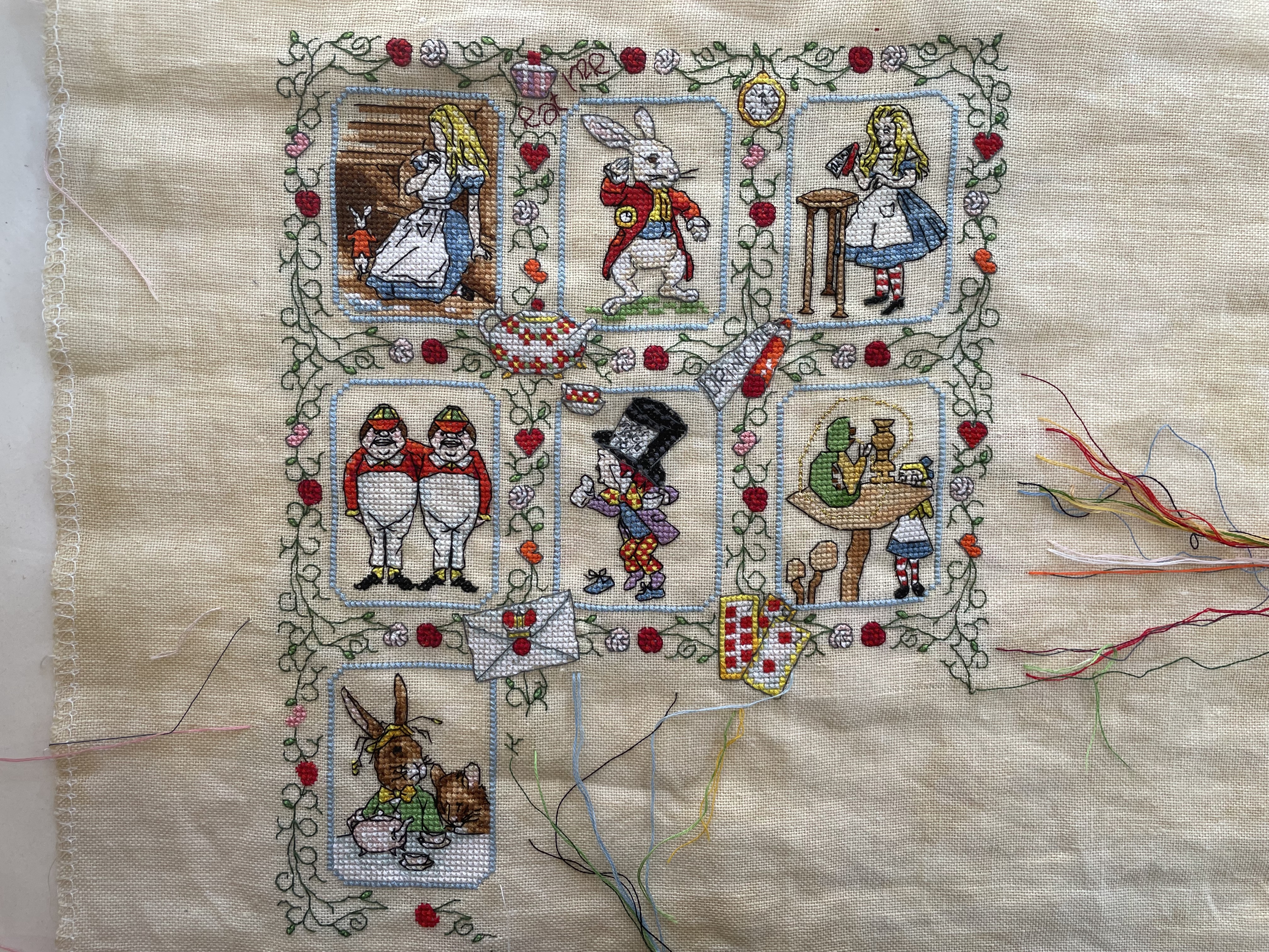 I finally buckled down with Alice, gave her 2.25 days, which was enough to finish the hookah panel (self charted) & border, and complete the March Hare with backstitch, 1,333 stitches. The border around March Hare was started (additional 212 stitches), but I didn’t have enough time to finish.