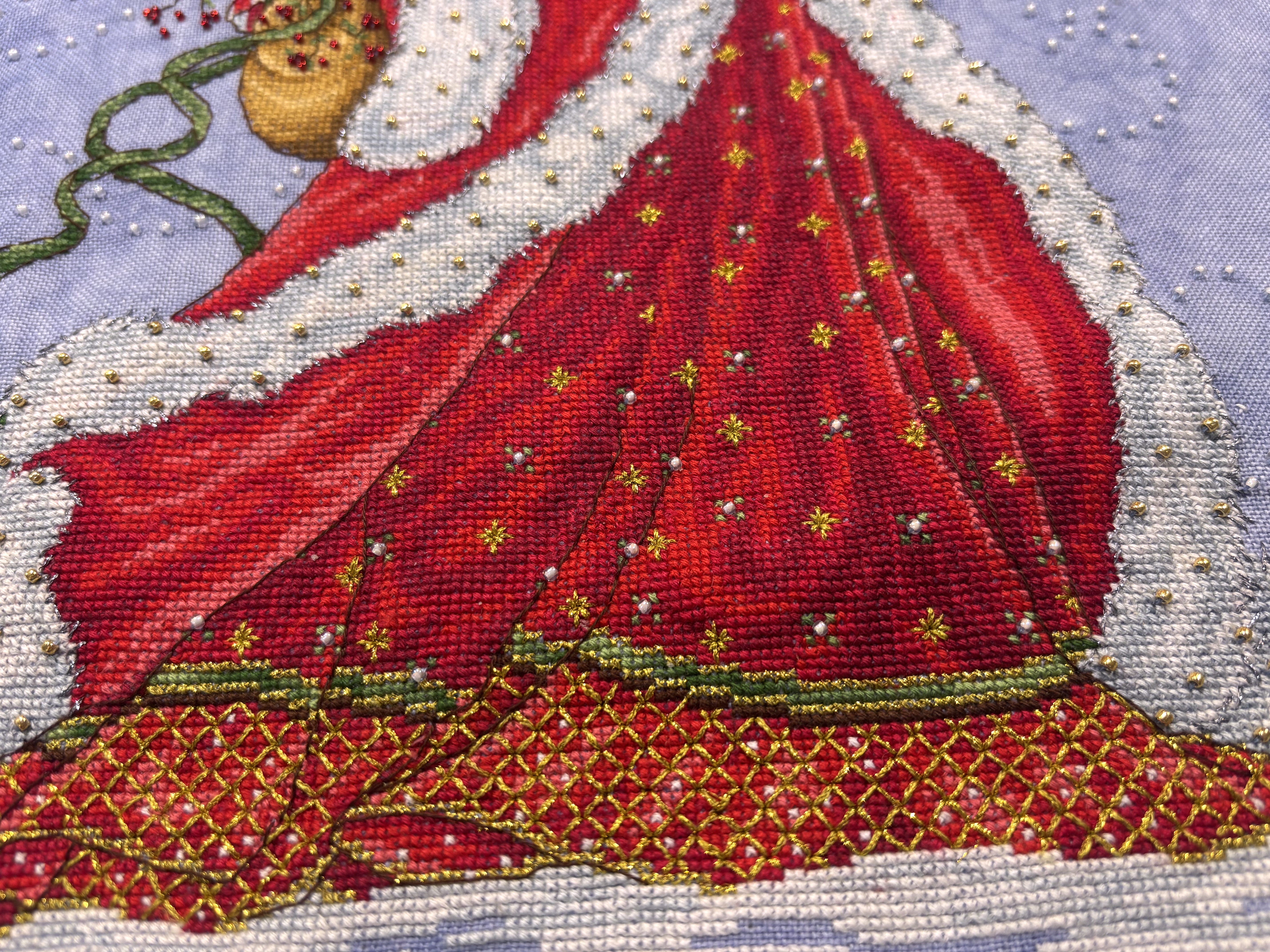 The pattern is fine, I used an old magazine chart but it is currently available, too. The chart is quite large and detailed with wonderful shading. A fair amount of fractional stitches are used, mainly for the toy sack, dove, and Santa’s face. There is a lot of backstitching, in a couple colors, which I did over 3 “sessions”. There are around 20 french knots, for eyes and decorations. The most challenging part was the backstitching in his beard, over the page break. Overall, it was a joy to stitch. The robe & gown are mostly long bands of color that worked up quickly. The major modification I made to the the chart was in the backstitching, I don’t do “stair step” backstitch for this kind of fancy chart, I think it deserves smooth curves and sharp corners.