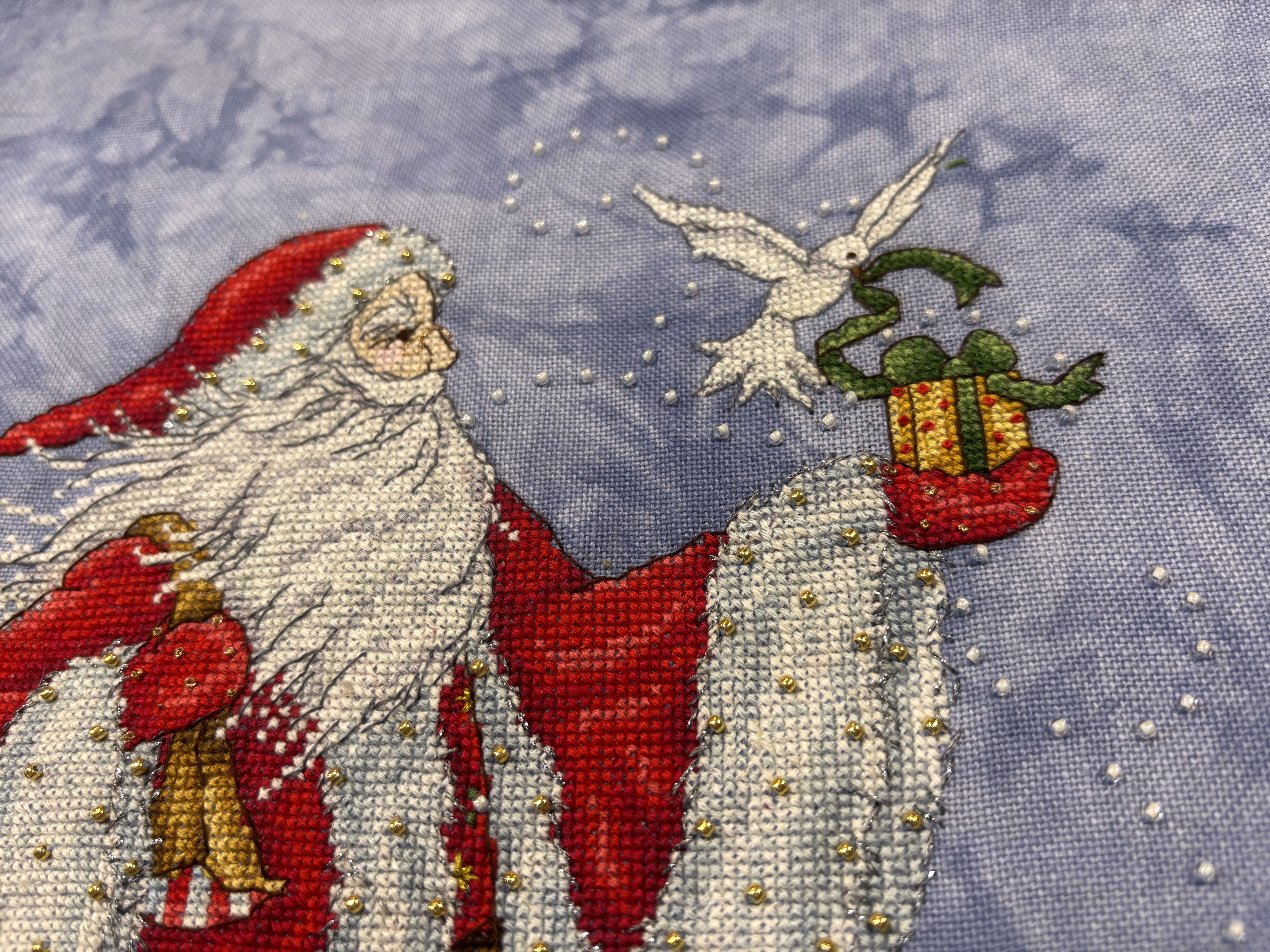 Father Christmas is my second of my “Joan Elliott Christmas series”…. (two angels, two Santas). I’m working on the Christmas Blue Angel now and Santa’s Gifts (with the animals) will be a focus next year. I was all gung ho to start Santa’s gifts, but then I realized his head is very similar to this one, though facing the opposite direction. My hubby chose another Joan Elliott chart for me to start soon.