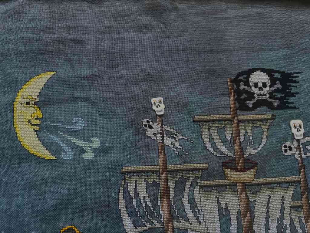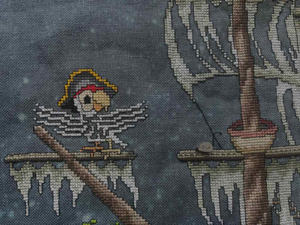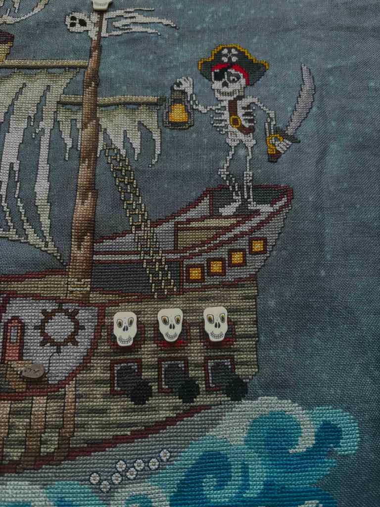 The materials, all as charted, were fine, though rather pricy. I enjoyed working with the Petite Silk Lame thread, it’s smooth and gives a subtle sparkle. Is is worth it though? I think DMC plus blending filament would give a similar effect. The buttons, by Just Another Button Company, are highly detailed and really fun. The fabric is dark blue with the light bleach splatter, but not that dark, I had no problem seeing it clearly.