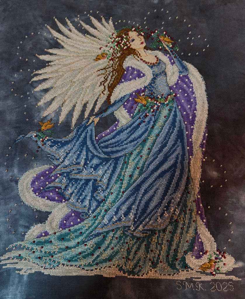 Last by not least, Christmas Blue Angel by Joan Ellliott (25 days, 26, 191 st) was my third Joan Elliott finish of 2025, and the third of four in my self selected “Joan Elliott Christmas series” . She was a joy to stitch, even on the dark fabric. I couldn’t be more pleased with how she pops and the night time effect.