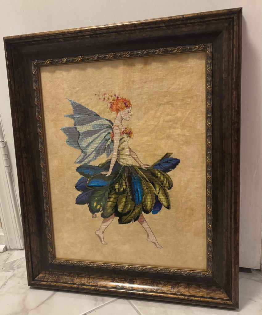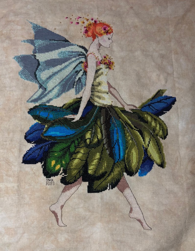12. Framing, well I did 2 frame jobs, one of which was photographs, the other was cross stitch, both of which were gifts. Here’s Feather Fairy fully finished in a dark wood frame with gold inlay. The fabric is not at all wrinkled, sorry for the weird lighting. Time was short. My craft room (where I prefer to work on framing) is currently out of commission, but I will get the space back in 2026.